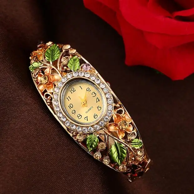 Женские часы с цветным кристаллом, браслет с цветным цветком из сплава, золотые часы, аналоговые кварцевые Классические наручные часы с драгоценным камнем