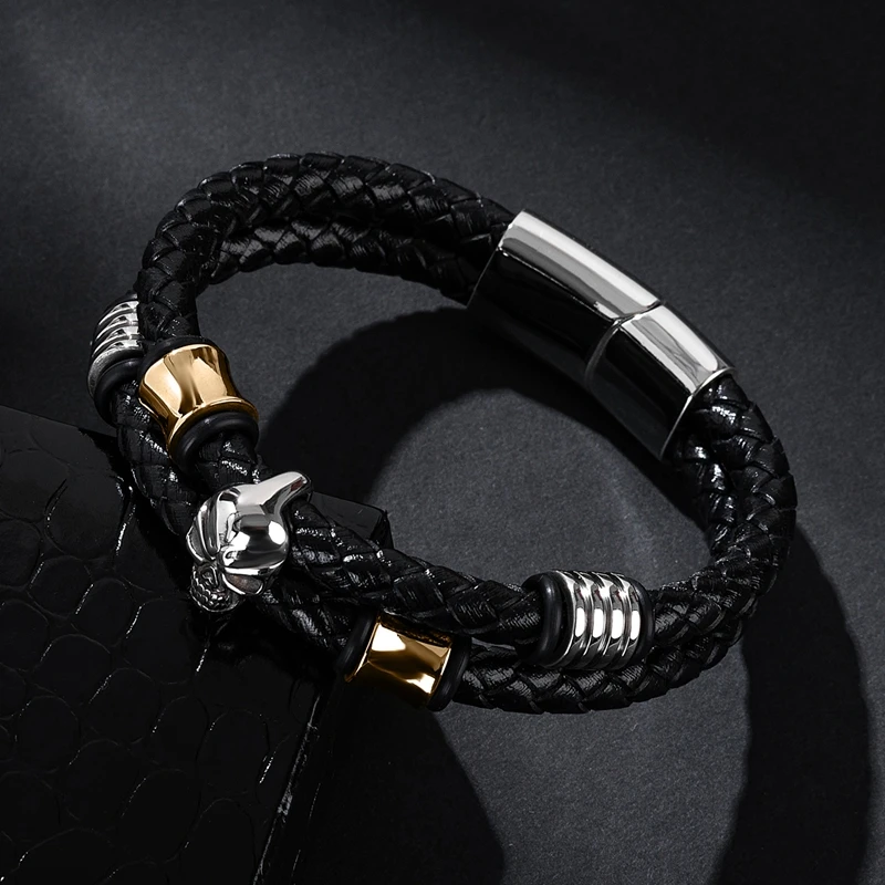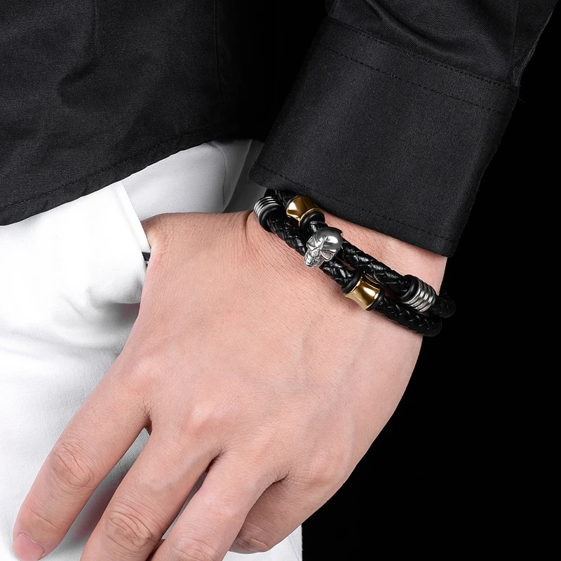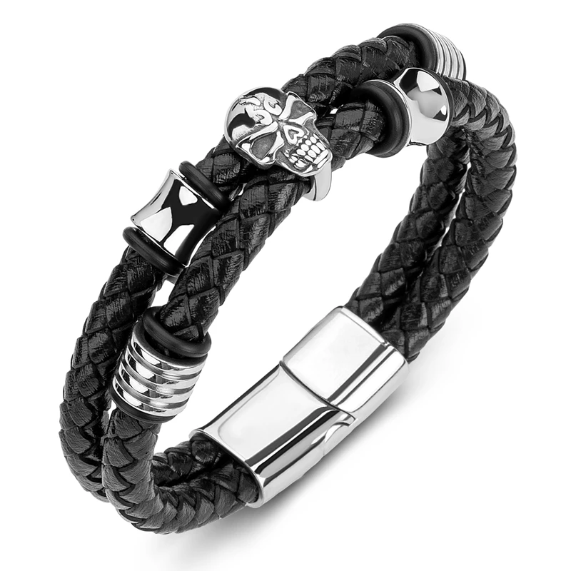 Двухслойные плетеные браслеты из натуральной кожи для мужчин, ювелирные изделия из нержавеющей стали с черепом, раньше, скелетом, мужской браслет на запястье P188