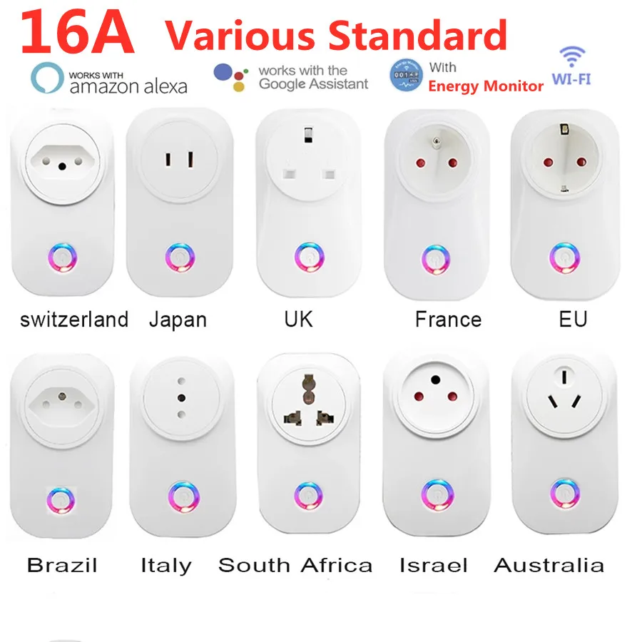Tuya WI-FI умная розетка смарт-штепсельная вилка стандарта ЕС, США, Великобритании покрытия AU BR FR JP Израиль Ita Мощность штекер 16A приложение Управление Alexa Google Home Energy монитор
