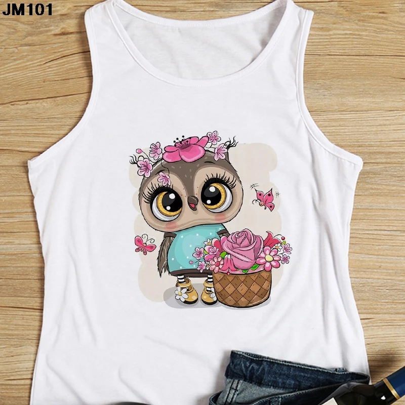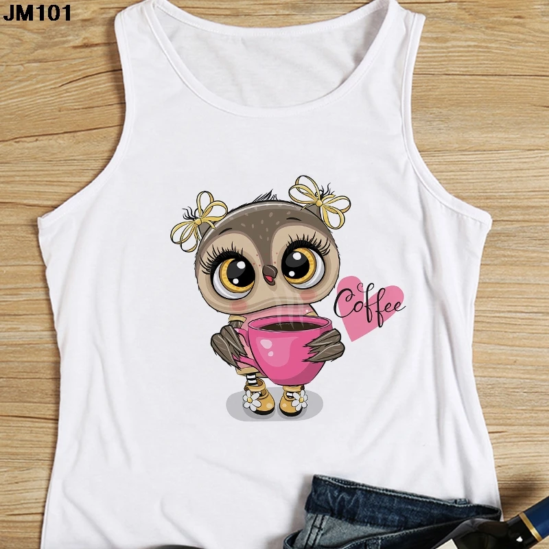 Женский топ без рукавов, белая футболка с круглым вырезом и принтом Совы в стиле Харадзюку, лето 2021