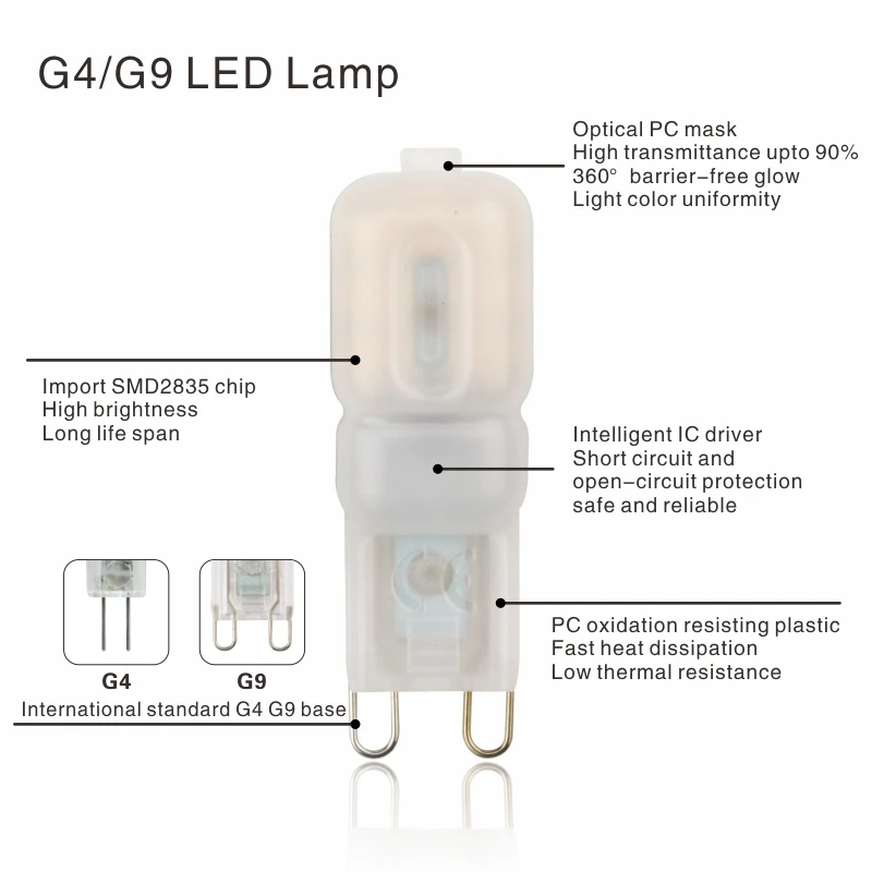 Три вида напряжения на выбор:DC12V, AC/DC12VИлиAC220-240V, Идеальная замена G4/G9 галогенная лампа непосредственно. Луч АГл 360 градусов, это самый широкий угол для освещения. Счет экономии электроэнергии: заменить галогенную лампу 20 Вт на светодиодный индикатор 3 Вт, сохранить 85% на счет электричества освещения. Простая установка: Стандартная база G4 / G9, может быть легко установлена вместо обычных галогенных ламп.