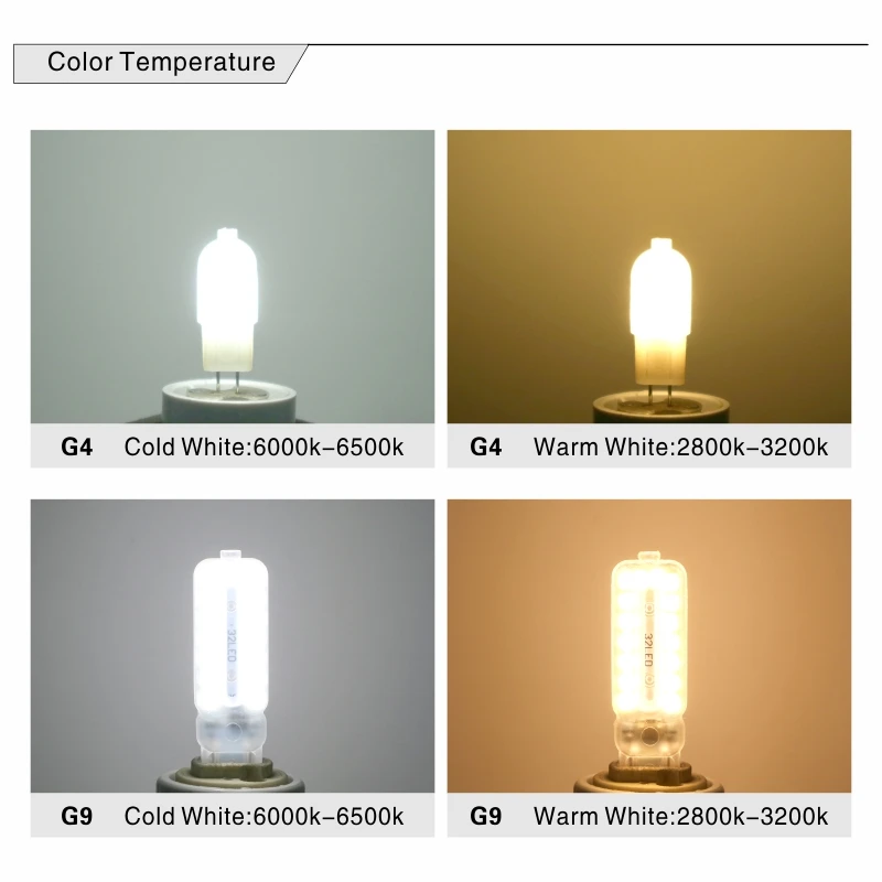 Характеристики: Тип цоколя: G4 / G9 Светодиодный чип Модель: SMD2835 Напряжение:G4 : DC12V, AC/DC 12VИлиAC220-240V; G9 : AC220-240V (Примечание:Пожалуйста, подтвердите необходимое напряжение перед покупкой.) Цветовая температура: теплый белый: 2800-3200K;Холодный белый: 6000-6500K Гарантия: 1 год
