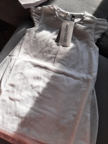 Описание: Платье из однотонного хлопкового трикотажа супрема. Верхний слой из набивной сетки с открытыми срезами. Сетка по центру горловины присборена. Рукава-крылышки из сетки в два слоя. По спинке застежка на пуговицу и петельку.