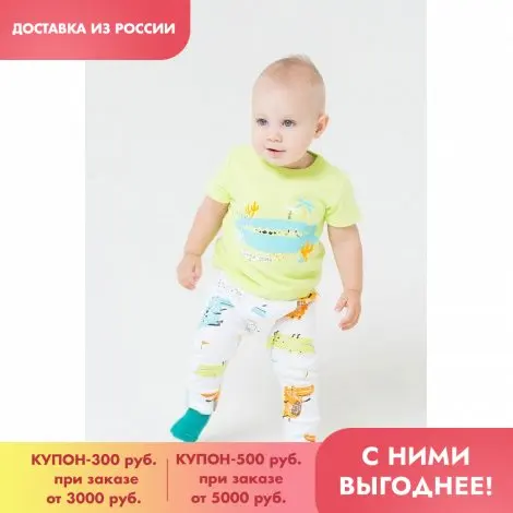 Описание: Комплект из хлопкового трикотажа интерлок. Однотонная футболка с короткими рукавами. Эластичная горловина. В области плеча застежка на кнопки-ободок, спереди принт. Штаны с набивным рисунком, цельнокроеный пояс, внутри эластичная тесьма. Манжеты из интерлока.