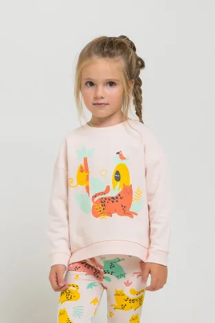 Описание: Белый джемпер для девочки из трикотажа супрем. Внизу - эластичный пояс с разрезами по бокам. На рукавах - мягкие манжеты. Полочка украшена крупным принтом.