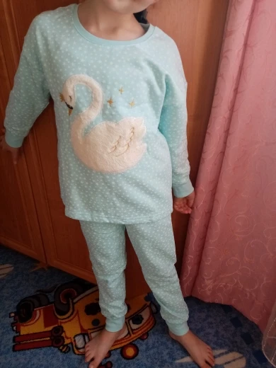 Классная пижама, в размер, внутри начес, лебедь их меха! Очень довольна, спасибо!!!брала двум дочкам размеры 104 и 122, размер 104 фотать не стала)