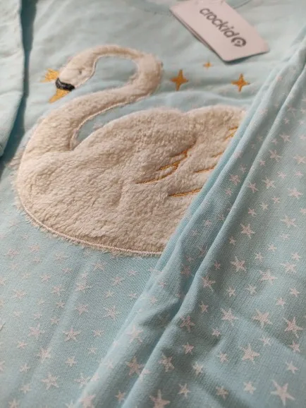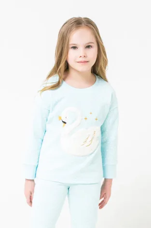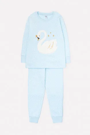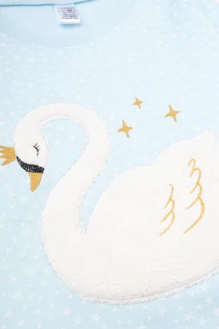 Описание: Тёплая хлопковая пижама с начёсом голубого оттенка со звёздочками для девочки согреет прохладной зимней ночью или в межсезонье. Состоит из джемпера и брюк. Джемпер со спущенными плечами украшен меховой аппликацией - мягким флисовым лебедем с вышивкой.