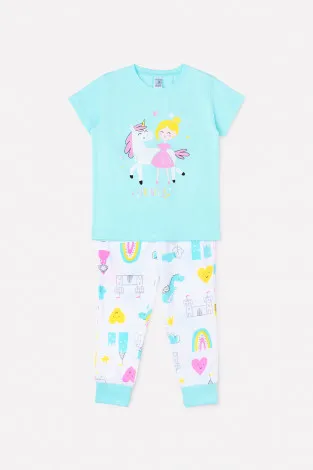 Описание: Пижама для девочки из трикотажа супрем. Однотонная футболка с принтом и брюки с набивным рисунком. Короткие рукава и низ футболки обработаны плоскими швами. В брюках эластичный пояс на резинке и широкие мягкие манжеты.