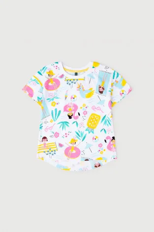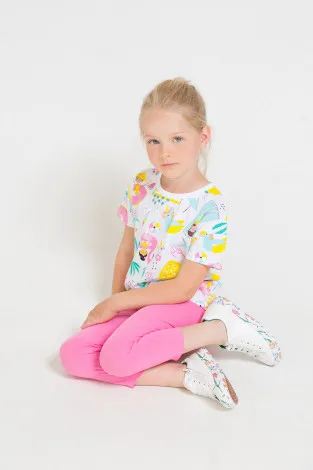 Описание: Летняя хлопковая футболка для девочки белого цвета с забавным принтом. Спинка удлинённая и закруглённая.