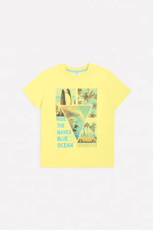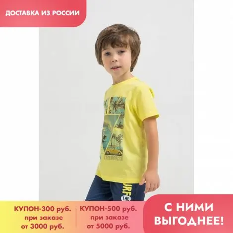 Описание: Футболка с короткими рукавами из трикотажа супрем бледного лимонного оттенка. На груди - крупный принт с рисунком и надписью.