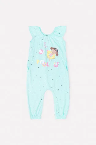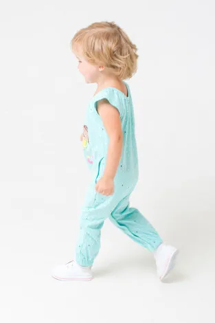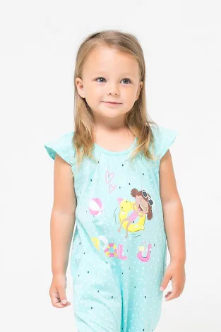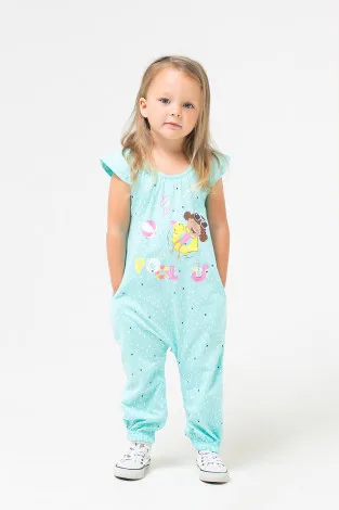 Описание: Летний хлопковый комбинезон для девочки яркого цвета "минт" с карманами и весёлым принтом. Застёгивается на кнопки.