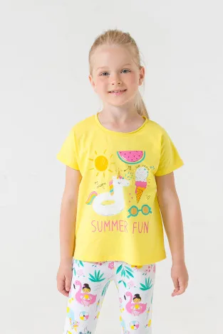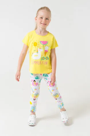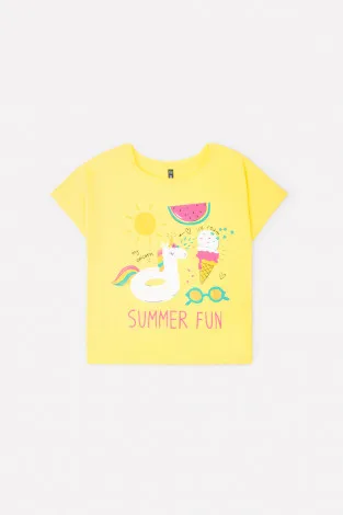 Описание: Хлопковая футболка для девочки сочного лимонного оттенка с летним принтом.