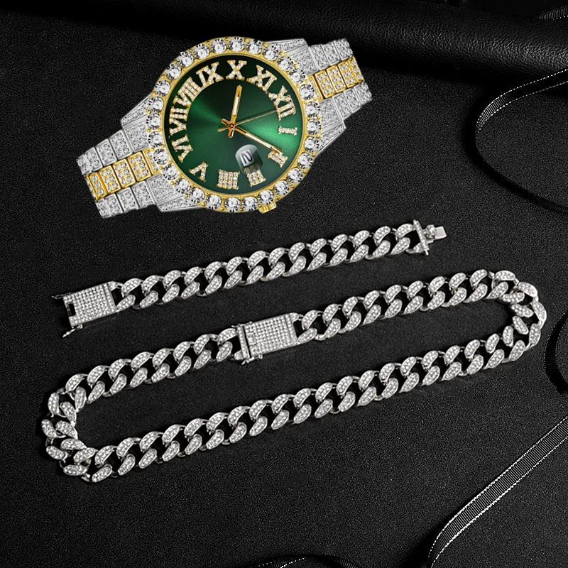 Роскошные сверкающие часы Майами, кубинская цепочка Майами, сверкающая цепочка, ожерелье, браслет, ювелирные изделия, мужской чокер в стиле хип-хоп, Cubana