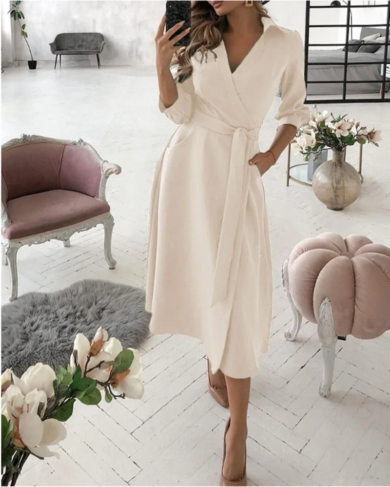 Женское платье-миди с длинным рукавом и V-образным вырезом