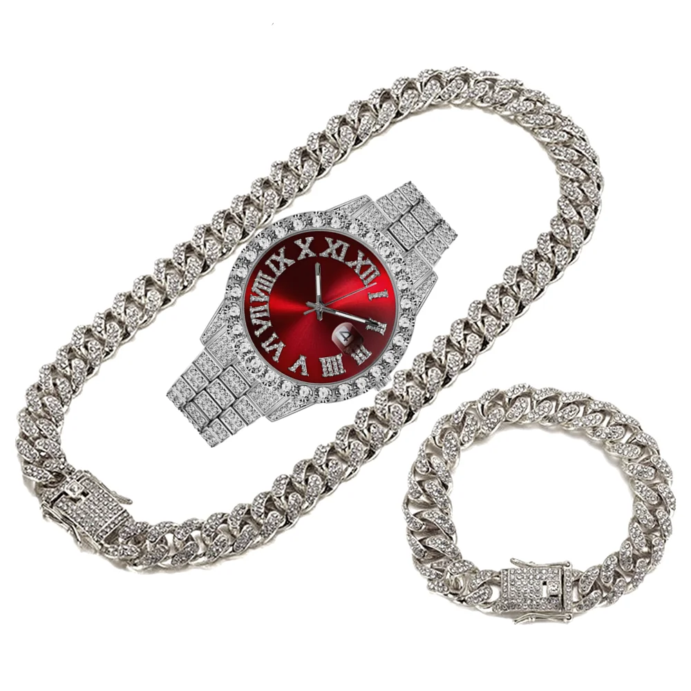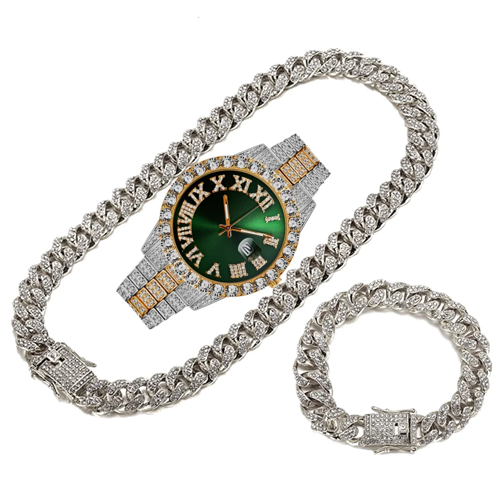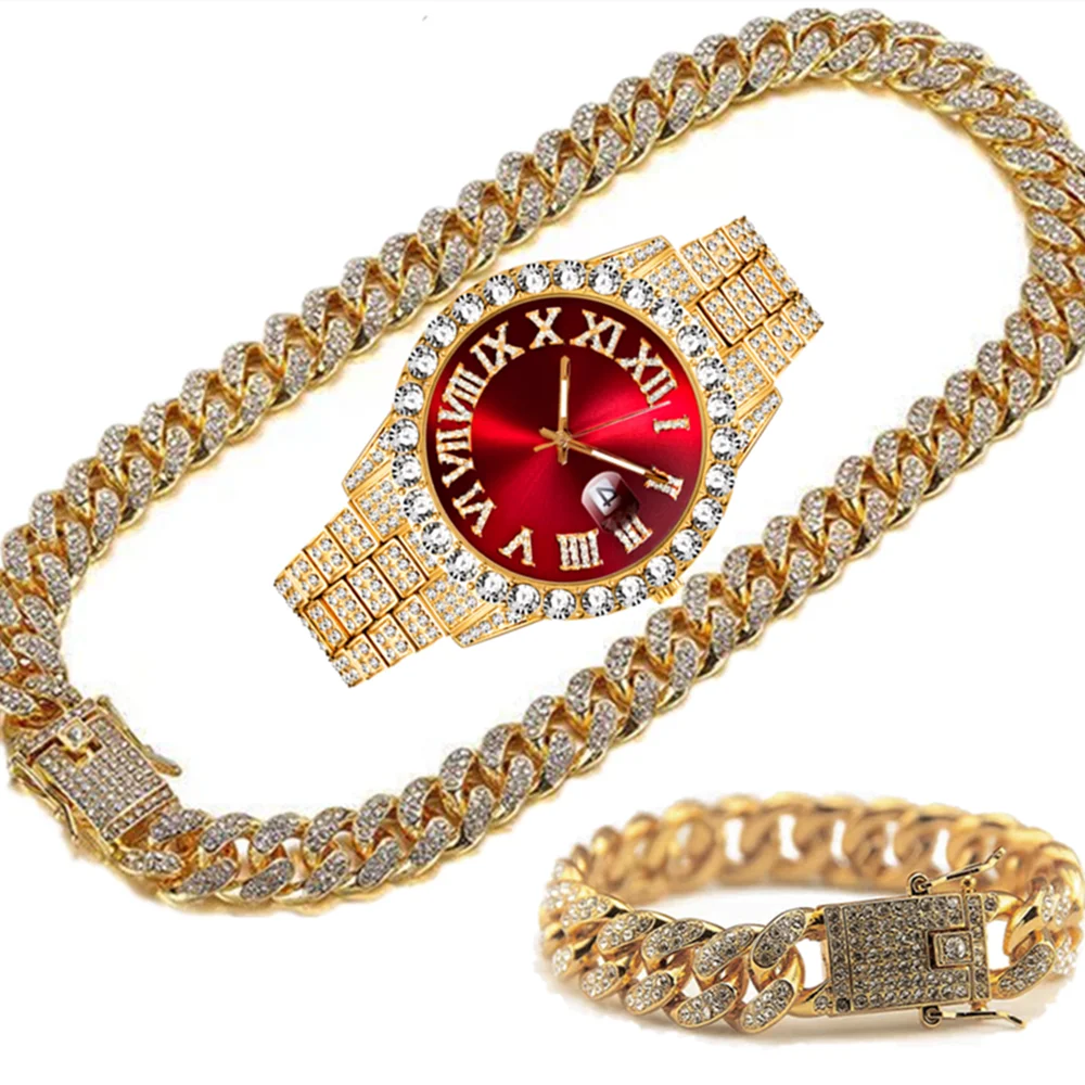 Роскошные золотые часы для мужчин, сверкающие мужские часы Майами из кубинской цепи, браслет, ожерелье, Ювелирный Комплект