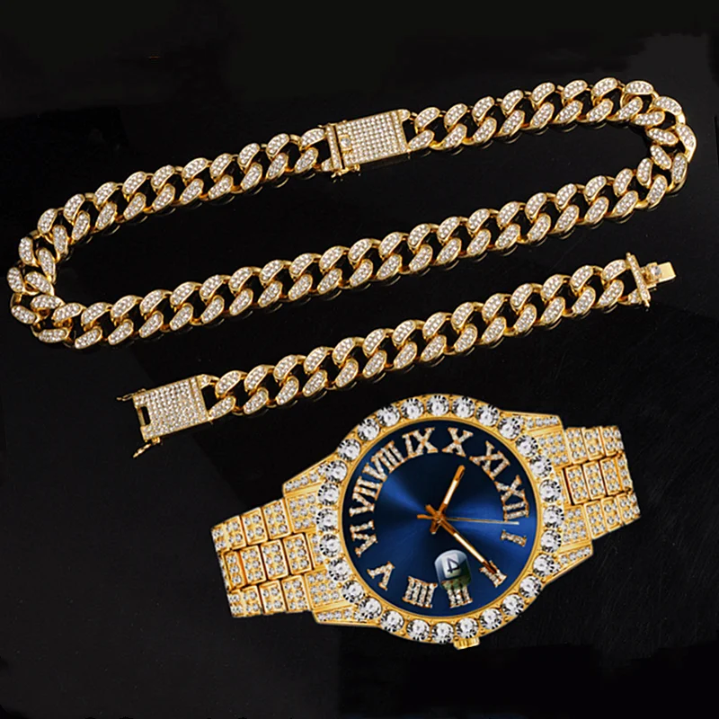 Кварцевые роскошные золотые серебряные часы для мужчин полный льдом часы для мужчин с украшениями в Майами кубинская цепь стразы браслет ожерелье комплект ювелирных изделий