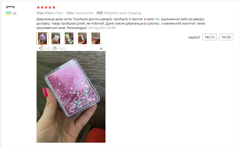 Дзеркальце дуже миле. Прийшло досить швидко, прийшло 3 серпня, а мало 14 , однозначно лайк за швидку доставку, товар прийшов цілий, не побитий. Дуже класне дзеркальце в сумочку , є маленький магнітик і воно закривається саме. Рекомендую!