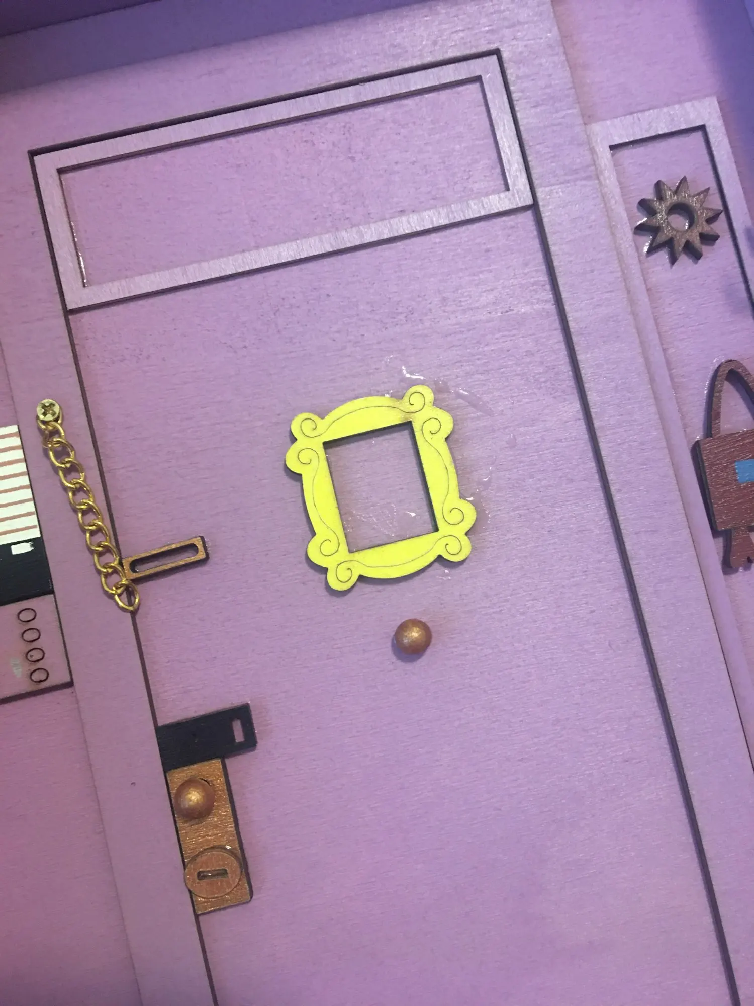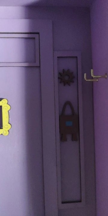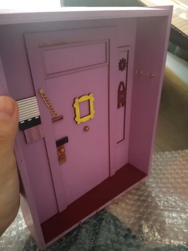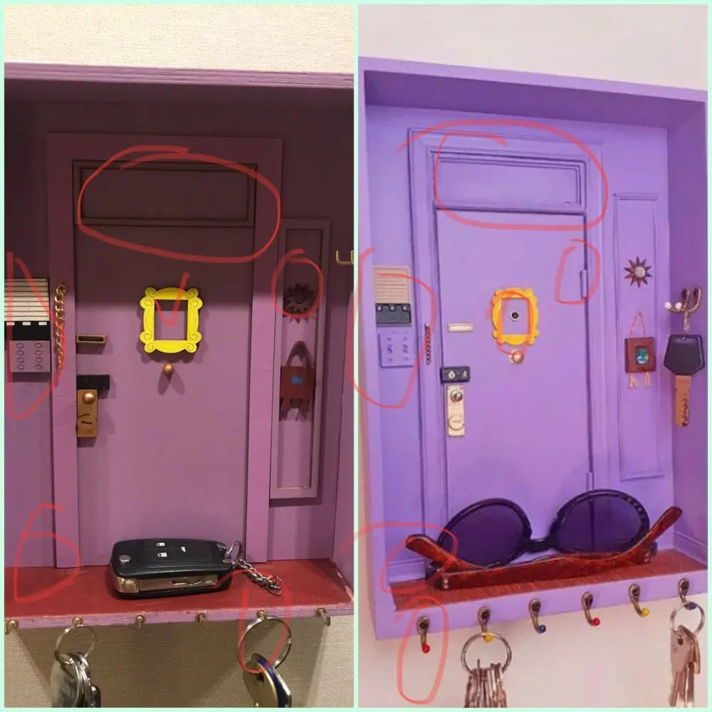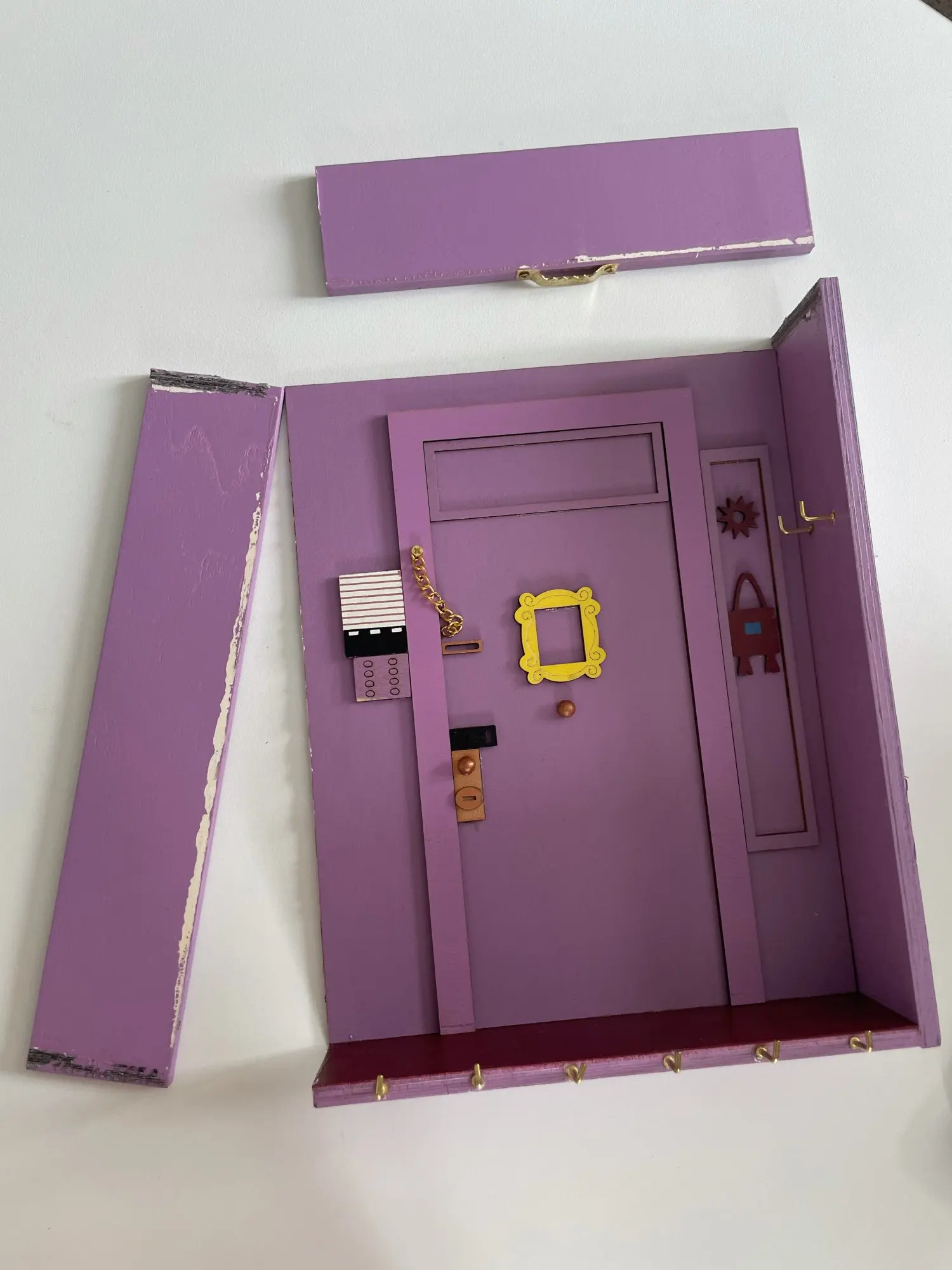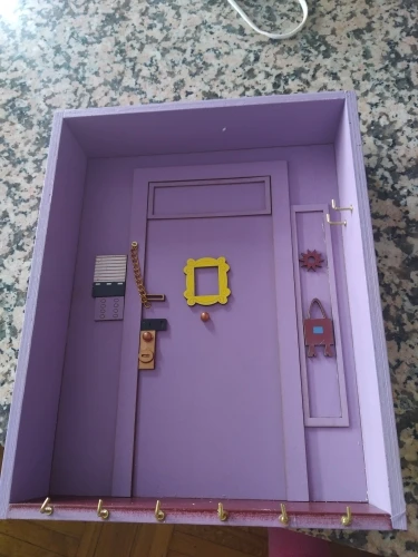 Пришла поломанная, боковая и нижняя часть не приклеенные. Пришлось шкурить и приклеивать самой. Качество тоже страдает. На фото отметила все недочеты. На фото от продавца видно, что сама дверь, над дверью и боковая настенная панель - выглядят правдоподобно, а в итоге упростили, всё без фризы, обычные прямоугольники. Нет плинтуса. Крючки без цветных шариков. Вообщем, три звёзды только из-за большой любви к сериалу.