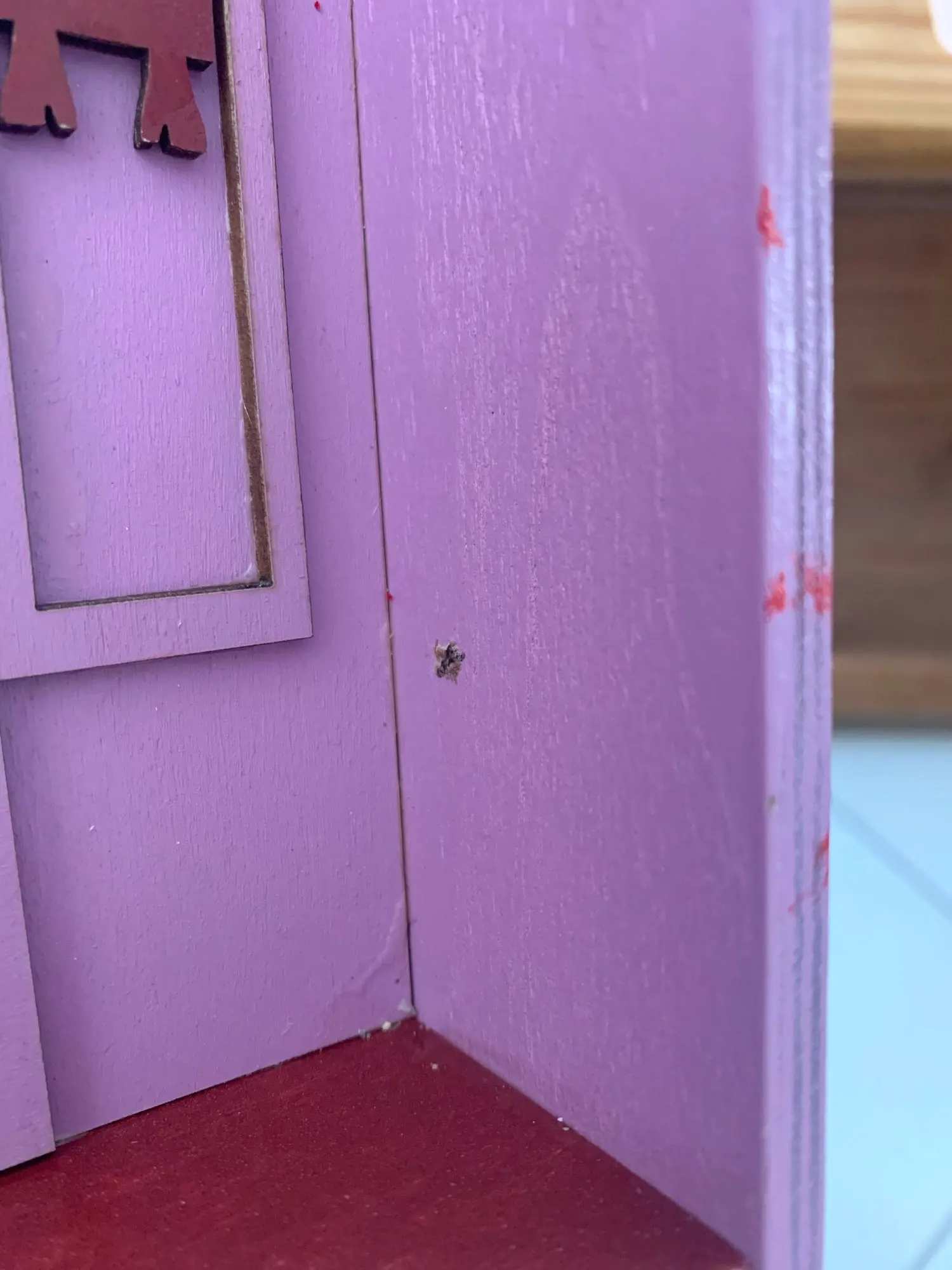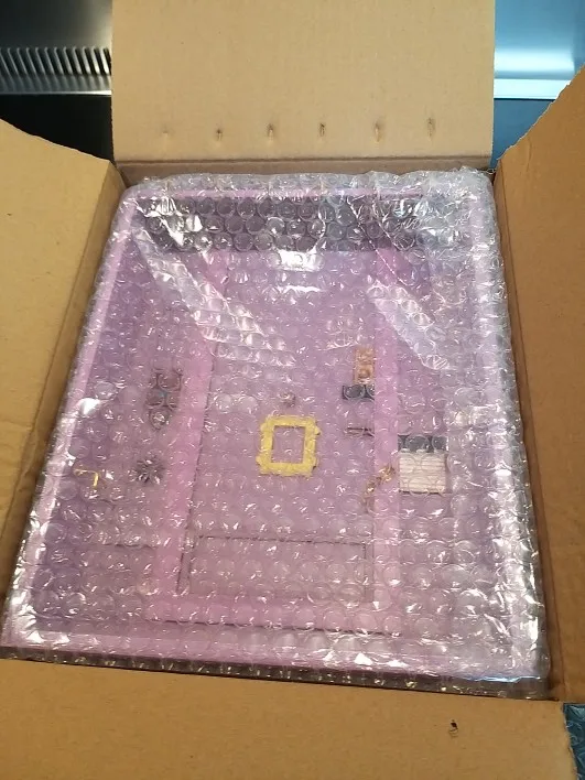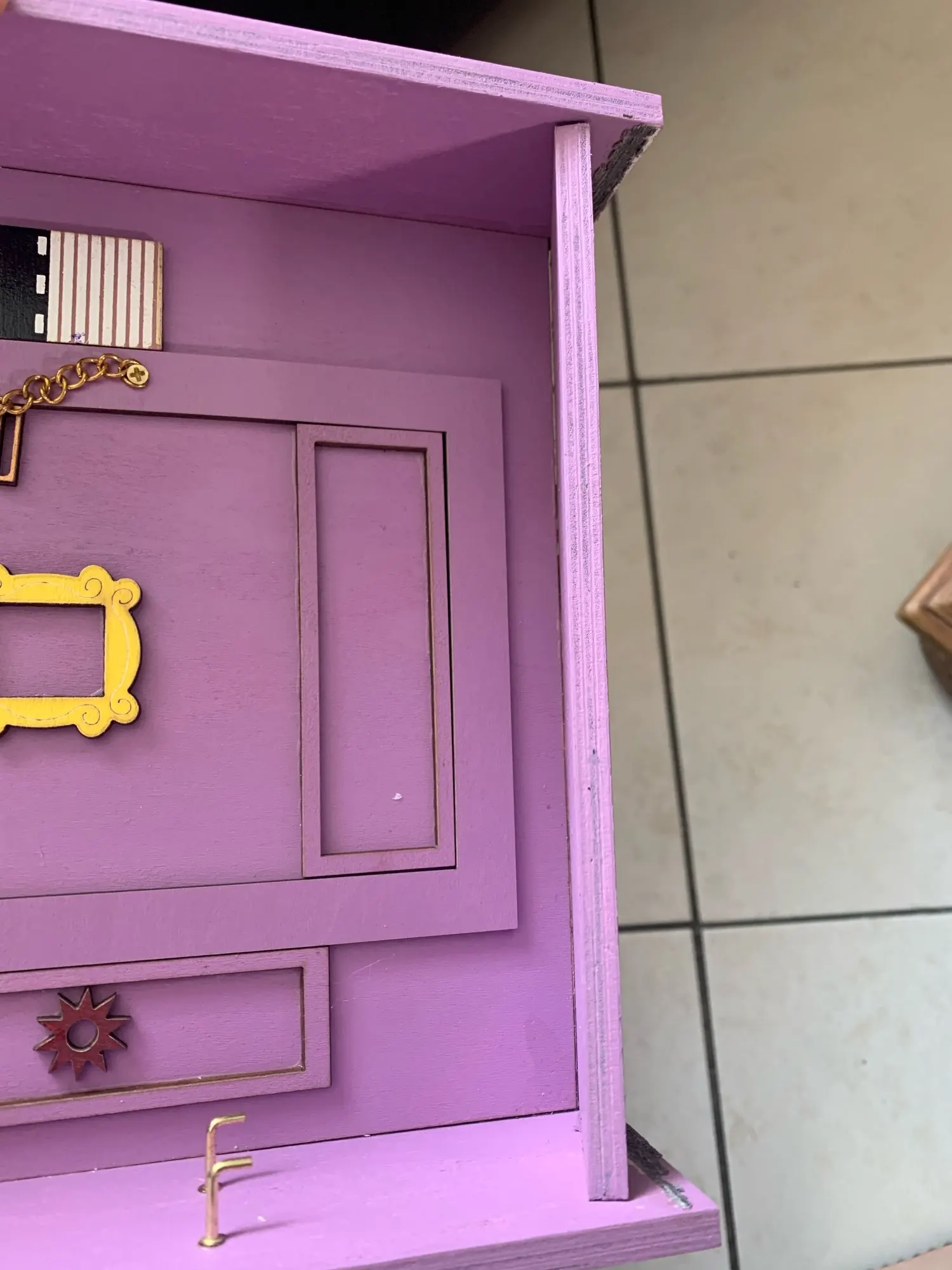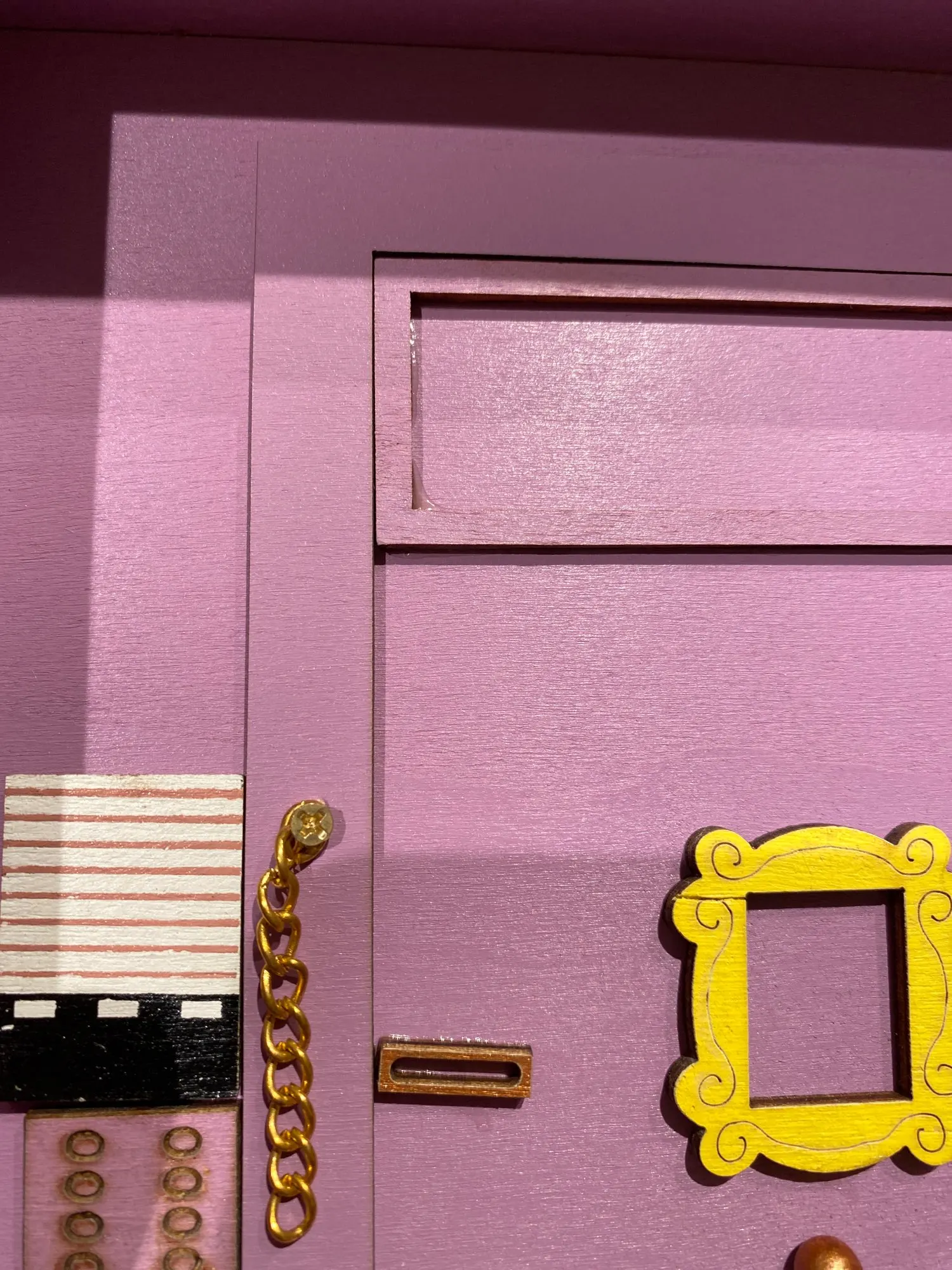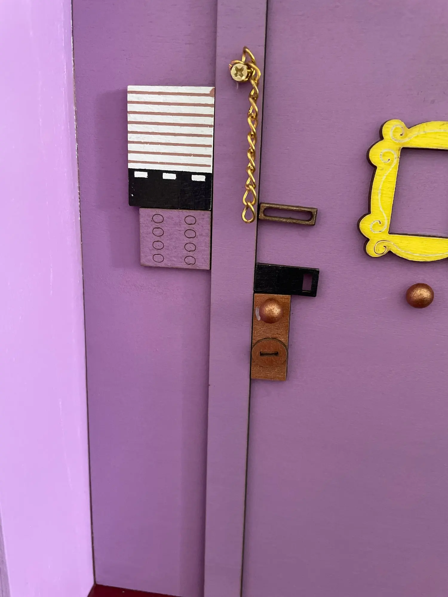 Пришла поломанная, боковая и нижняя часть не приклеенные. Пришлось шкурить и приклеивать самой. Качество тоже страдает. На фото отметила все недочеты. На фото от продавца видно, что сама дверь, над дверью и боковая настенная панель - выглядят правдоподобно, а в итоге упростили, всё без фризы, обычные прямоугольники. Нет плинтуса. Крючки без цветных шариков. Вообщем, три звёзды только из-за большой любви к сериалу.