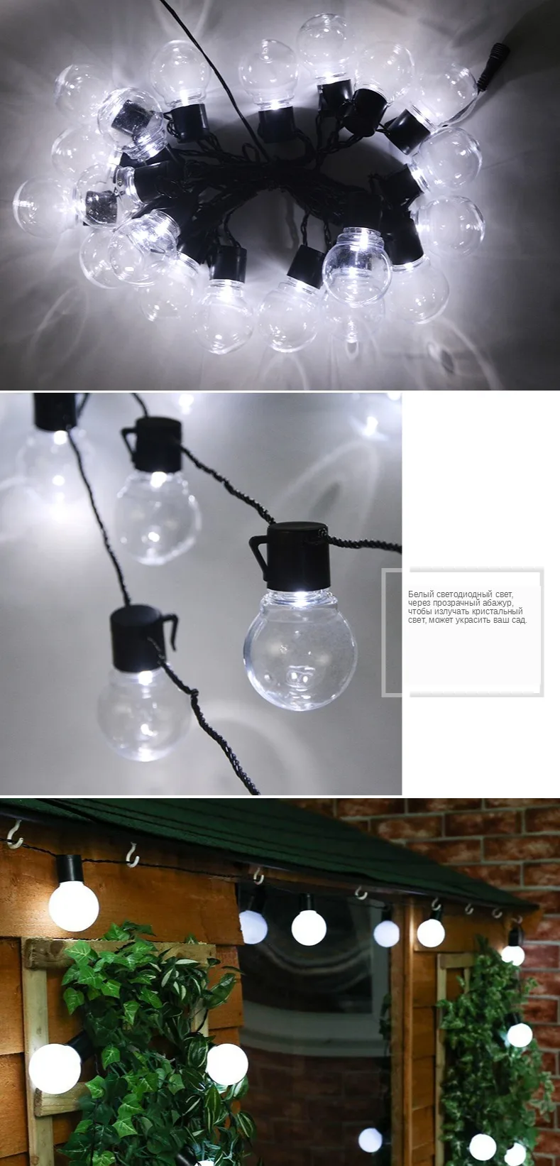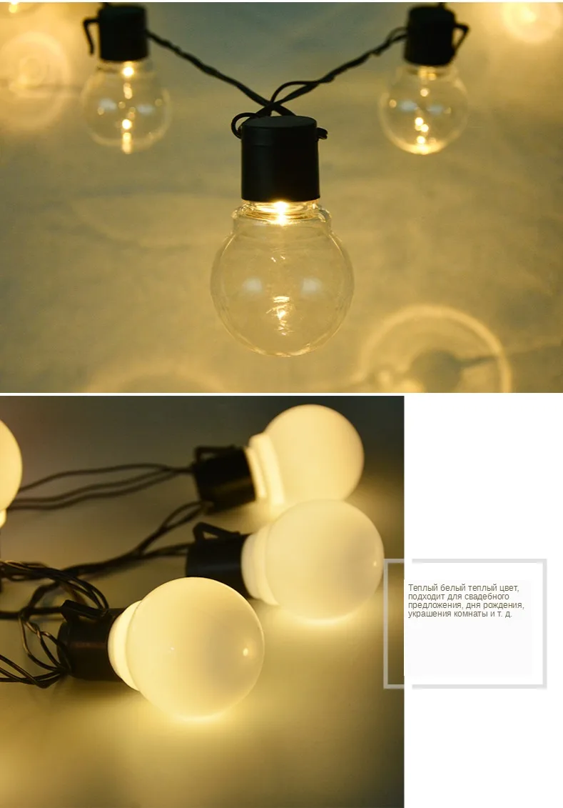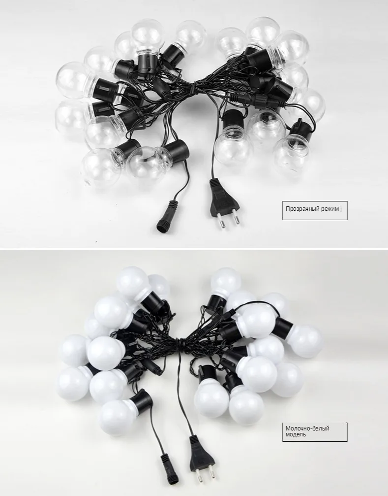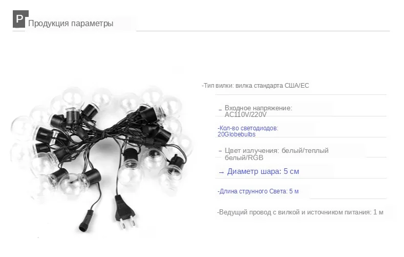 Входное напряжение: AC110V/ AC220V (штепсельная вилка США/штепсельная вилка ЕС) Длина: 2,5 м/5 м Количество ламп: 10 шт/20 шт Водонепроницаемость: IP65 Абажур: молочный/прозрачный Срок службы лампы: 30000 часов Цвет излучения: белый/теплый белый/сменный Цветовая температура: 2800k-3500k (теплый белый); 6000k-6500k (белый) Материал изделия: медь и ПВХ Тип вилки: штепсельная вилка европейского стандарта Подключение до макс. 15 нитей (100 м)