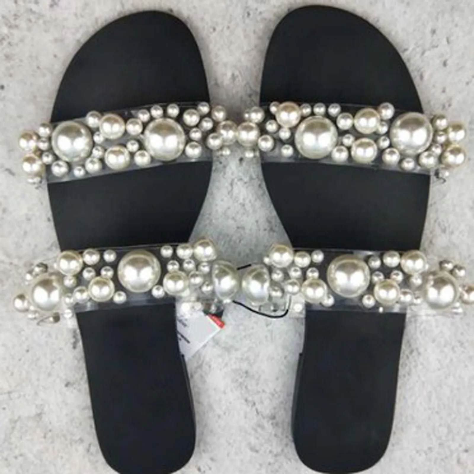 Женские богемные шлепанцы с жемчугом, сандалии на плоской подошве с открытым носком, женская летняя обувь, новый стиль 2021, прозрачные сандалии на плоской подошве