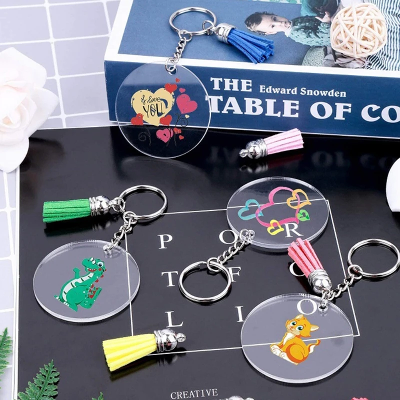 Посылка:12 шт х брелки+12 шт x Красочные кисточки+12 шт х круглые акриловые заготовки+12 шт. х прыгающих колец (В общей сложности 48 штук и 12 комплектов)
