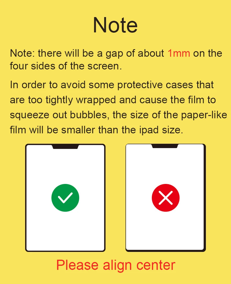 Для того, чтобы избежать некоторых защитных чехлов, которые слишком плотно обернуты и заставляют пленку выдавливать пузырьки, Размер бумажной пленки будет меньше, чем размер ipad.