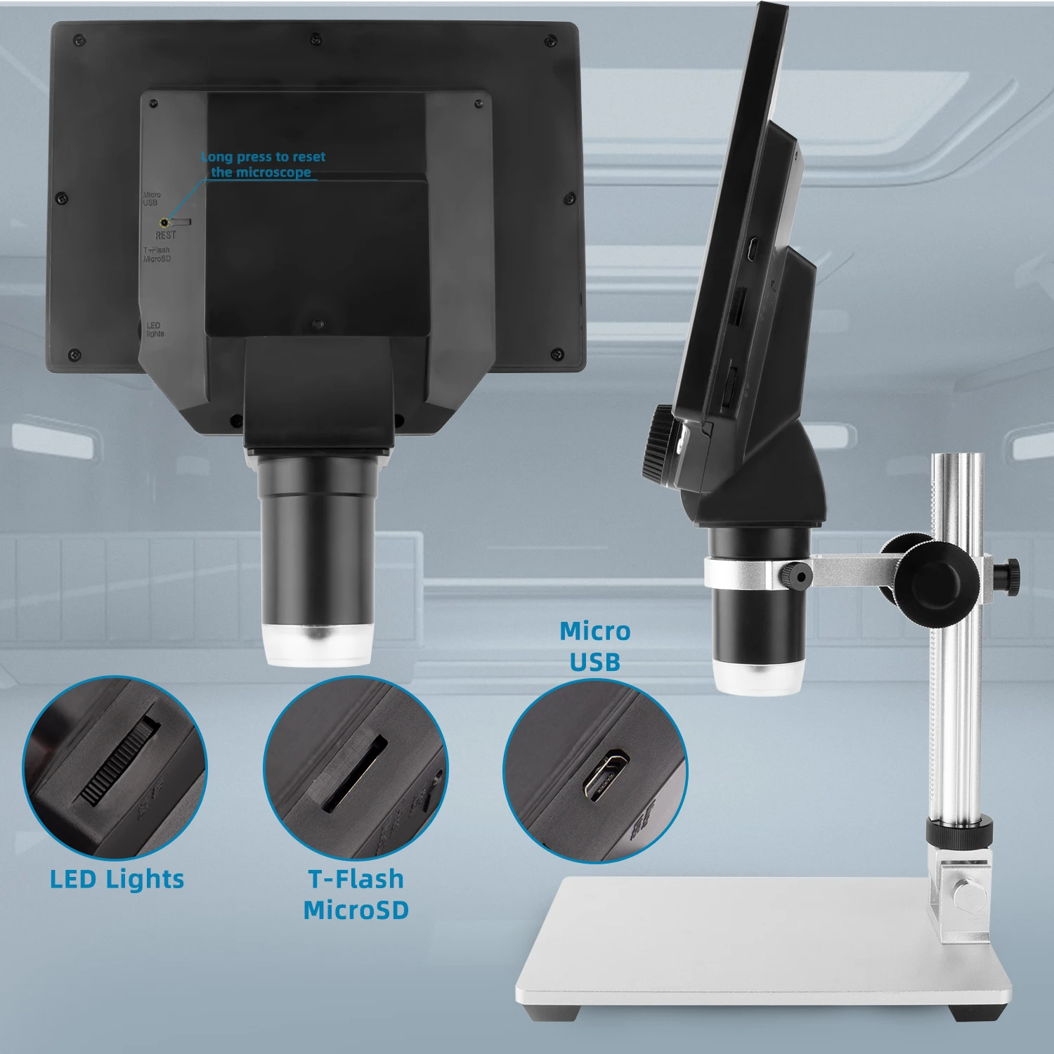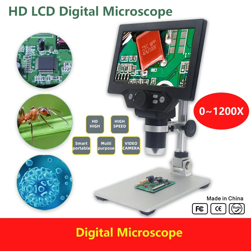 ● 7 дюймов ЖК-дисплей дисплей.● Регулируемая высокая яркость 8 светодиодов.● Поддержка Micro SD-карты 64G (не входят в комплект).● С функцией автоматического выключения.● Питание от литий-ионного аккумулятора (встроенный).● Это поможет вам легко увидеть крошечные предметы с помощью профессионального микроскопического объектива.● Поставляется с подставкой из алюминиевого сплава.