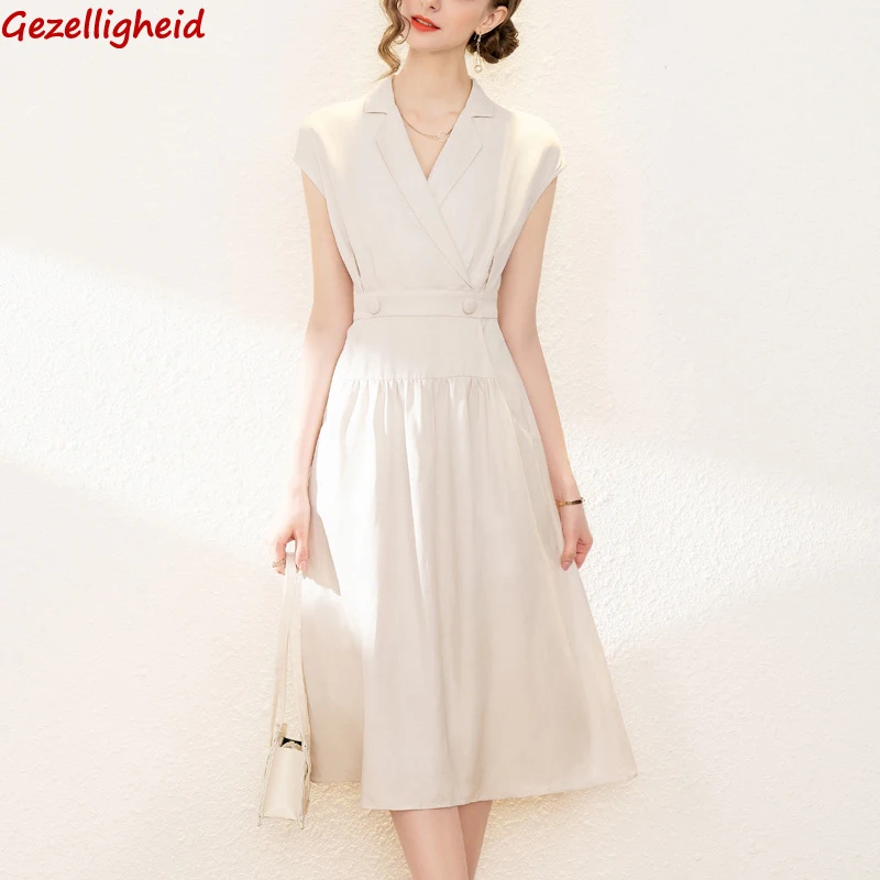 Платье Gezelligheid для женщин, Новинка лета 2021, модное элегантное тонкое женское уличное платье, Роскошное однотонное платье средней длины из хлопка и льна со складками