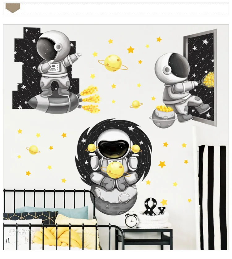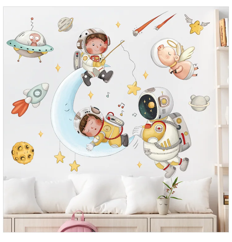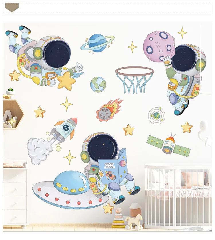 Мультяшный космический астронавт, настенные наклейки для детской ко...