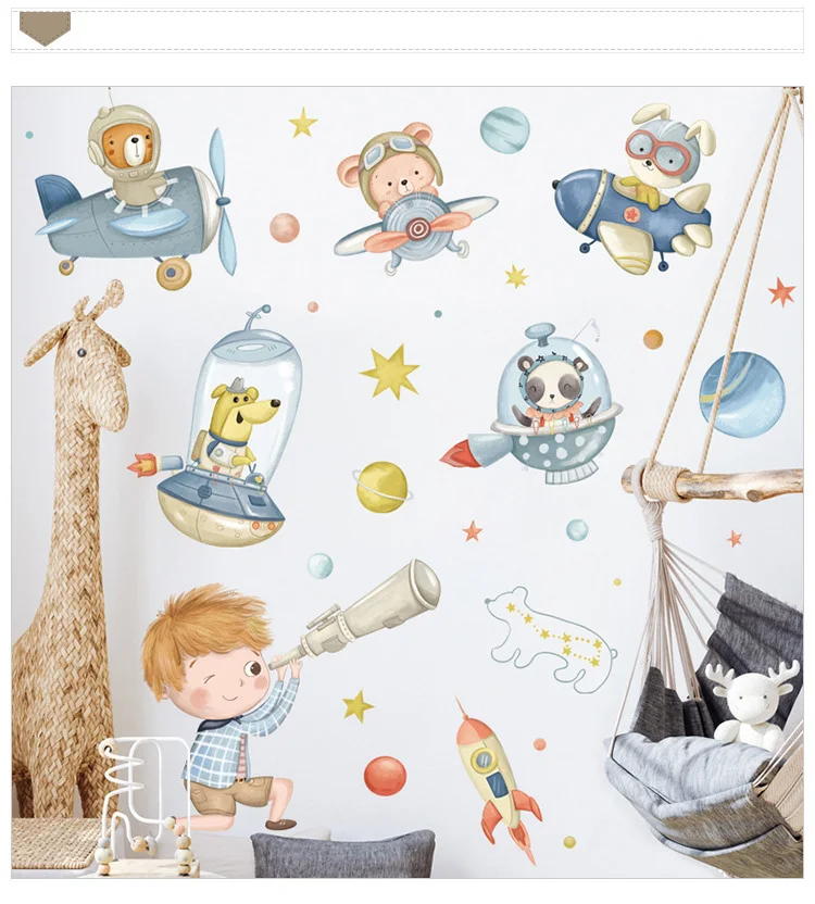 Мультяшные животные, космический полет, настенные наклейки для детс...