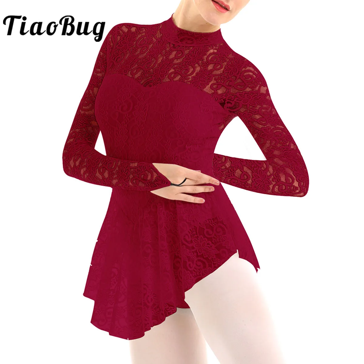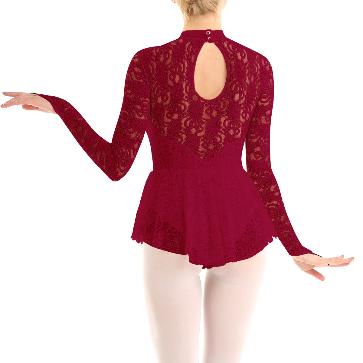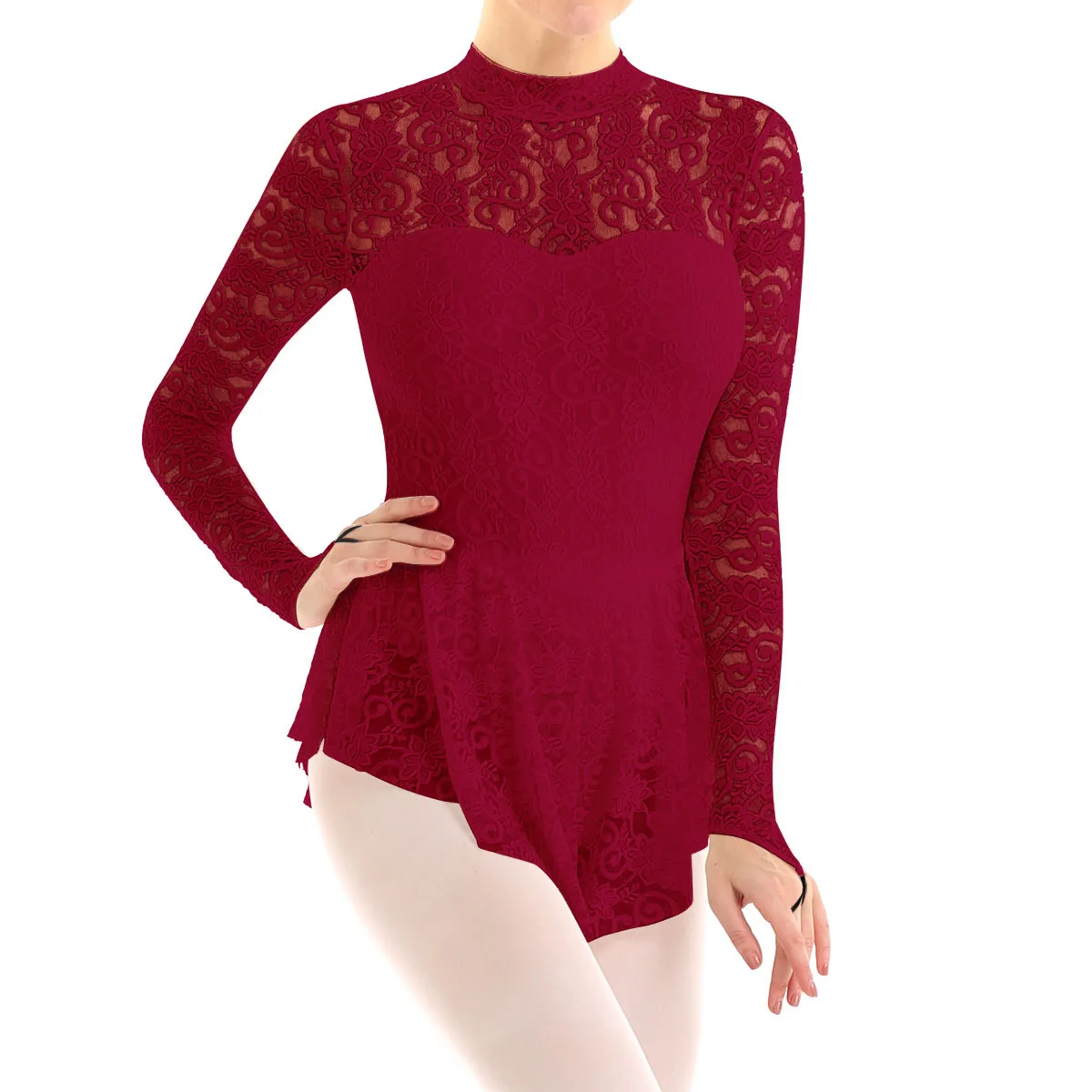 Для женщин и девочек с высоким воротом кружева Фигурное катание на коньках ролика для катания на коньках, танцевальное трико, платье с длинным рукавом Одежда для бальных танцев