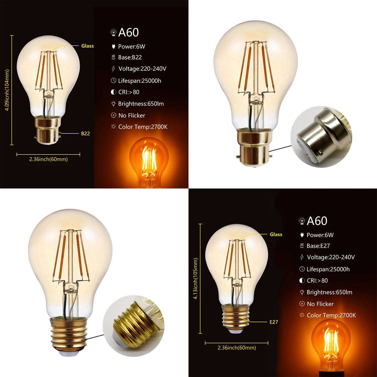 2021 Focos Ретро Filamen Светодиодная лампа A60 6 Вт B22 27004000k ...
