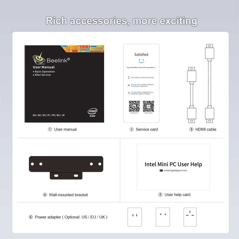 1 мини-ПК,1 х адаптер питания,2 x HD-MI кабель,1 х Настенный кронштейн,1 x Руководство пользователя