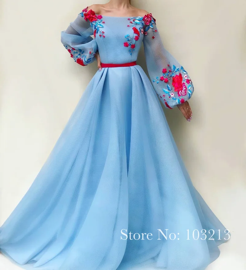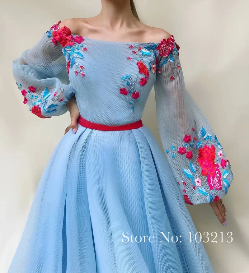 Новая модель средства ухода за кожей Шеи буфами на рукавах одежда с длинным рукавом платья для выпускного вечера элегантные трапециевидной формы светильник синего цвета с аппликацией и вышивкой платье торжественное мероприятие халаты с поясом