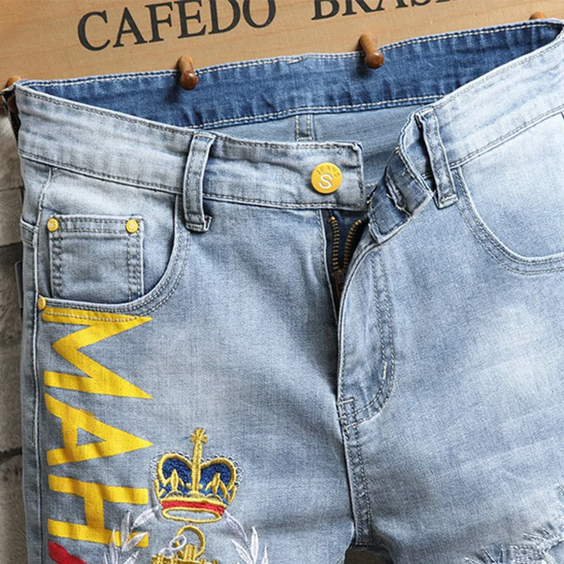 Мужские джинсовые шорты с вышивкой, тонкие рваные брюки с пятью точ...
