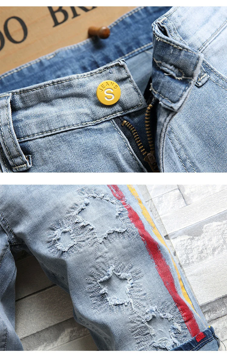 Дизайнерские Рваные джинсовые шорты с нашивками, мужские летние шорты в стиле хип-хоп, мужские джинсовые шорты с искусственными нашивками, мужские джинсовые шорты