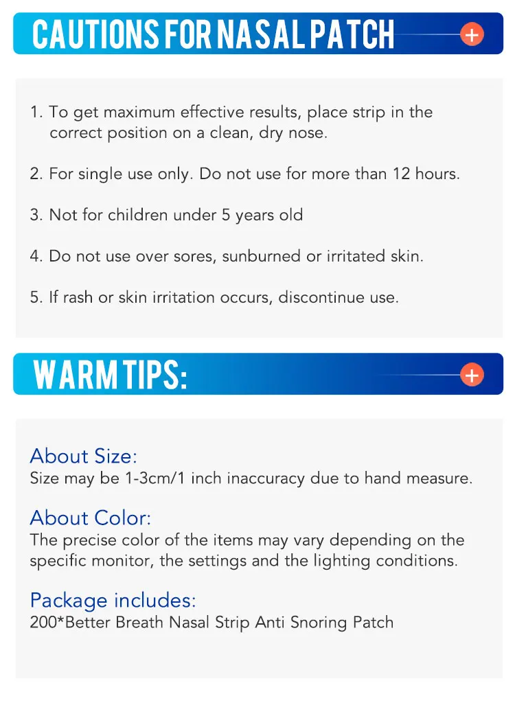 О размере: размер может быть на 1-3 см/1 дюйм неточность из-за ручного измерения.О цвете: точный цвет изделий может отличаться в зависимости от конкретного монитора, настроек и условий освещения.Посылка включает в себя:50 * Лучшая дыхательная полоска на нос от Храпа Анти Храп патч