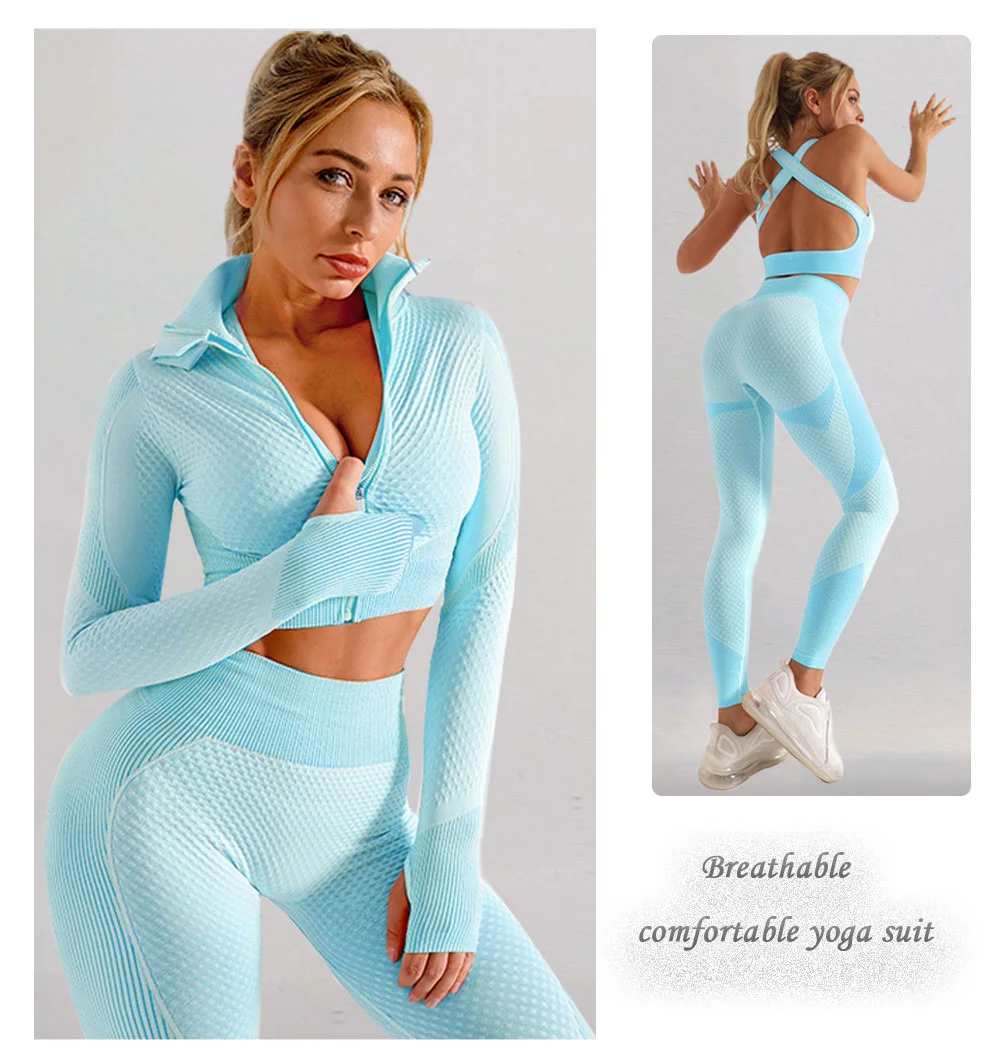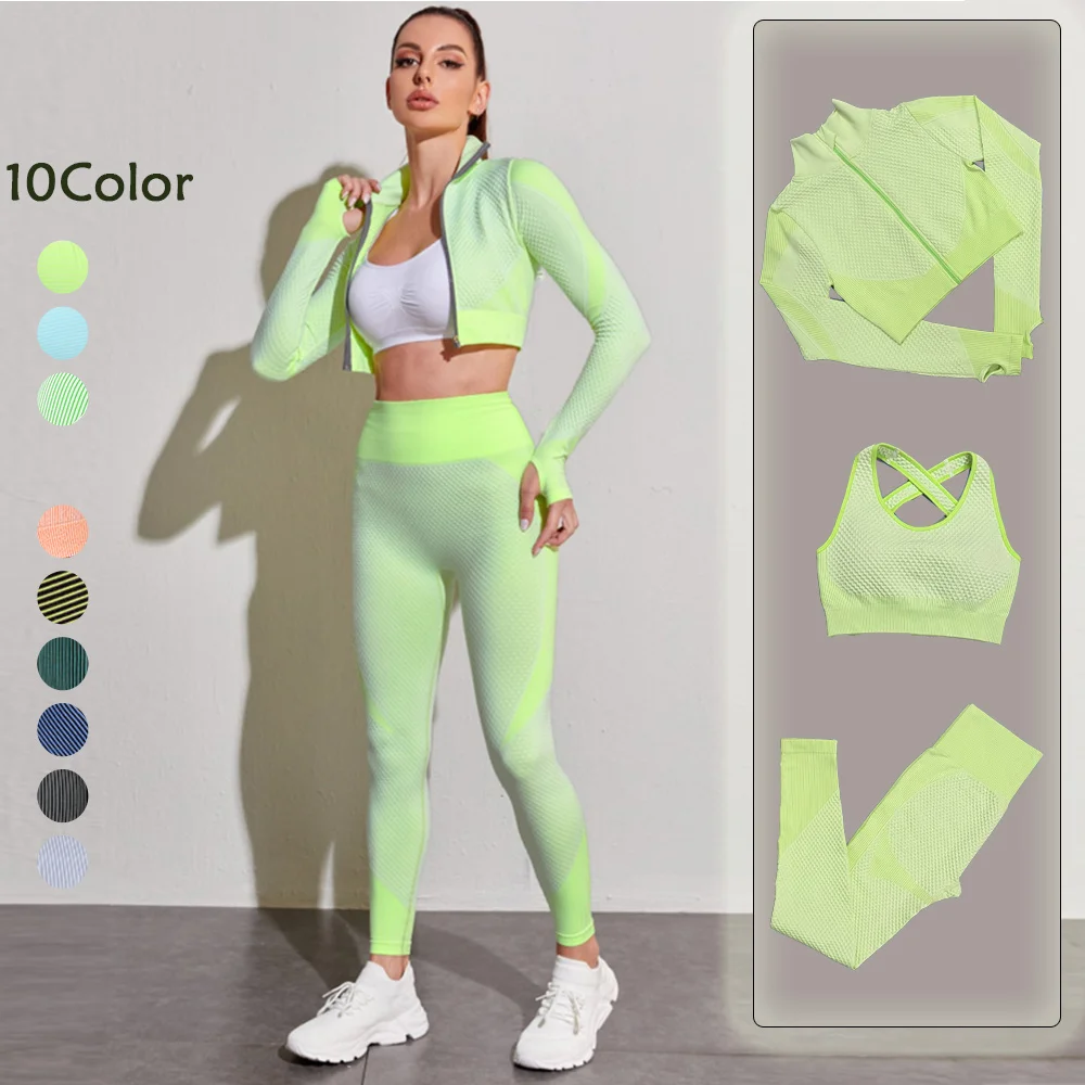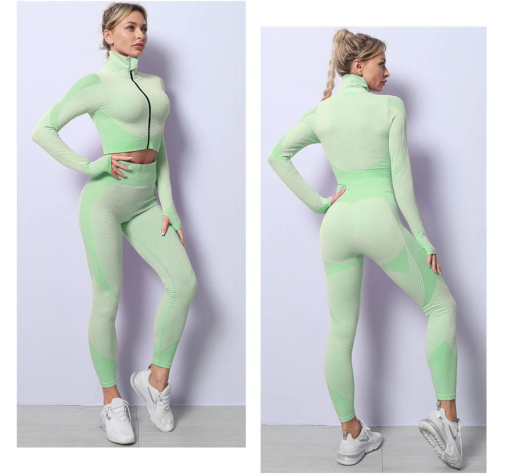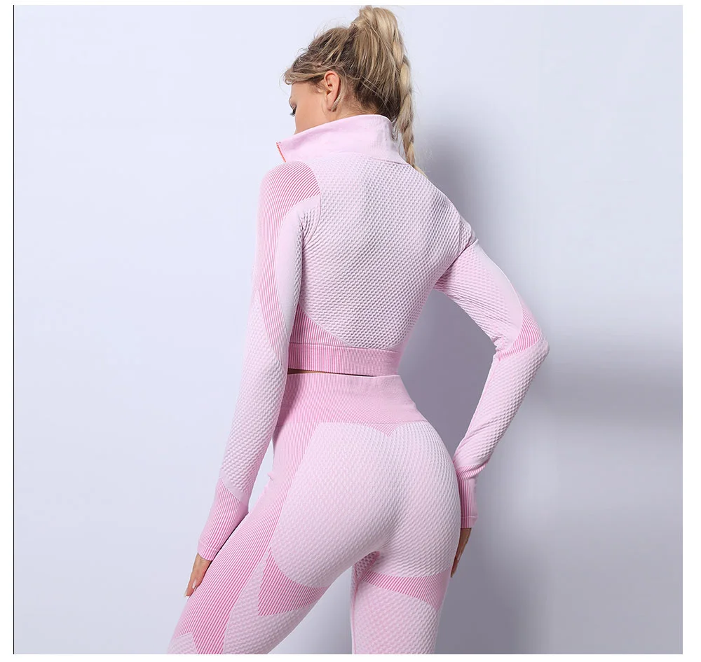 Бесшовный Женский комплект для йоги, одежда для спортзала, короткий топ с длинным рукавом, леггинсы с высокой талией, спортивная одежда для тренировок, спортивный костюм для фитнеса, одежда для йоги