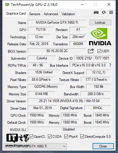 • 100% оригинал NVIDIA GeForce GTX1660TI 6 ГБ• 100% натуральная 6 ГБ GDDR6 192 бит• Частота ядра: 1500/1770 МГц• Потоковый процессор: 1536SP• Частота памяти: 12000 МГц• Тип интерфейса: PCI Express 3,0 16X• Интерфейс ввода/вывода: HDMI DVI DisplayPort• 3D API: DirectX 12• Разъем питания: 8pin• Максимальная потребляемая мощность: 120 Вт• Рекомендуемая мощность: 450 Вт выше