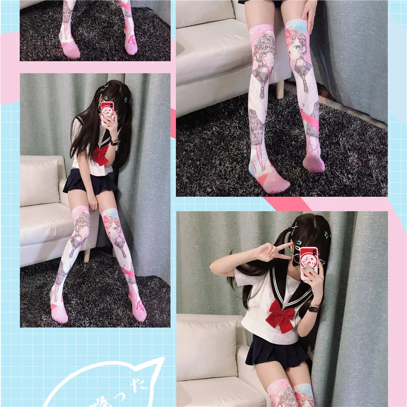 Модные женские шелковые чулки до бедра с 3D принтом, эластичные персонализированные тонкие милые розовые чулки для косплея с аниме-героями мультфильмов