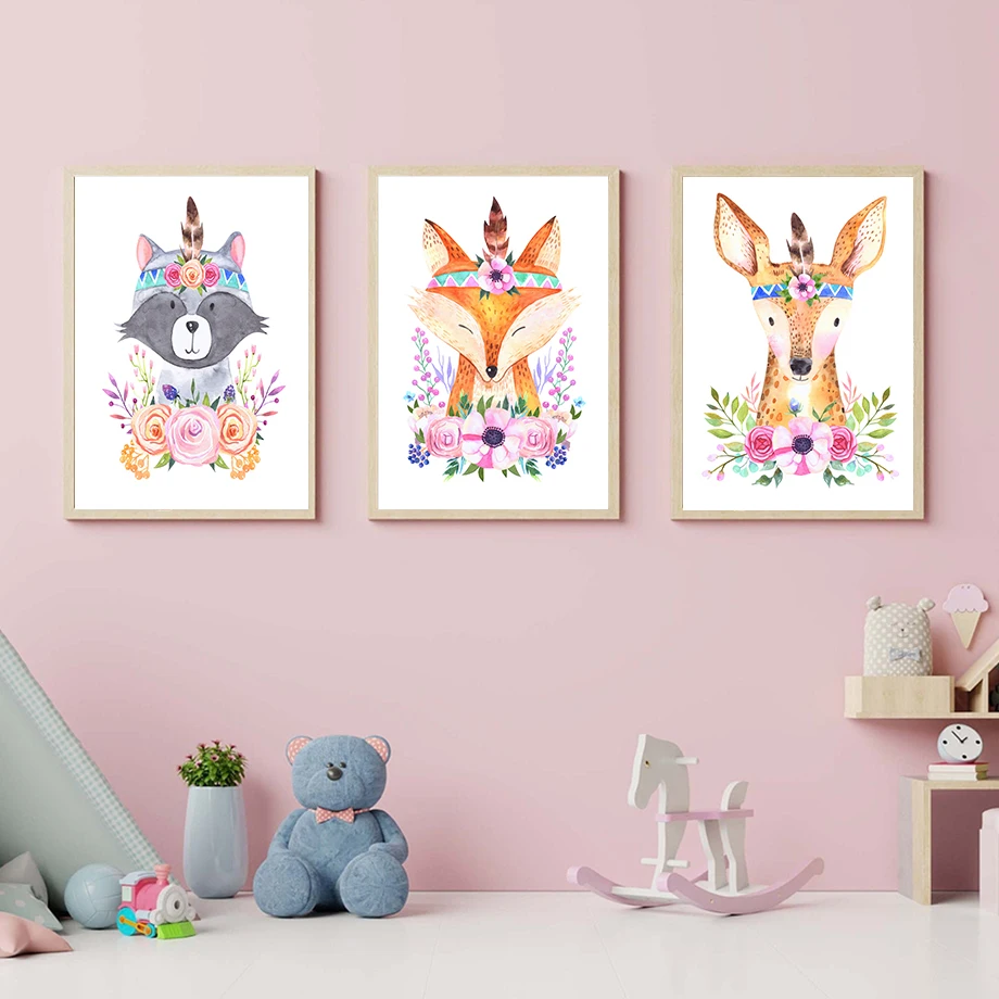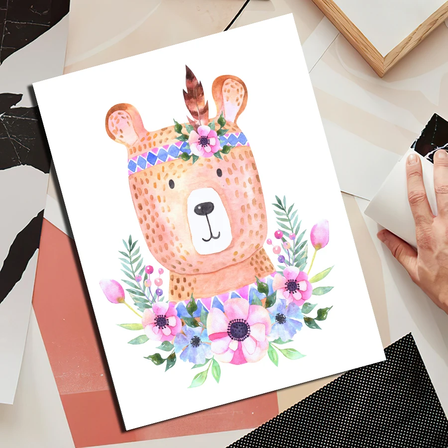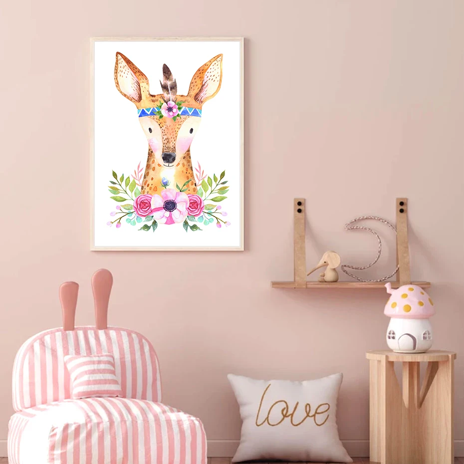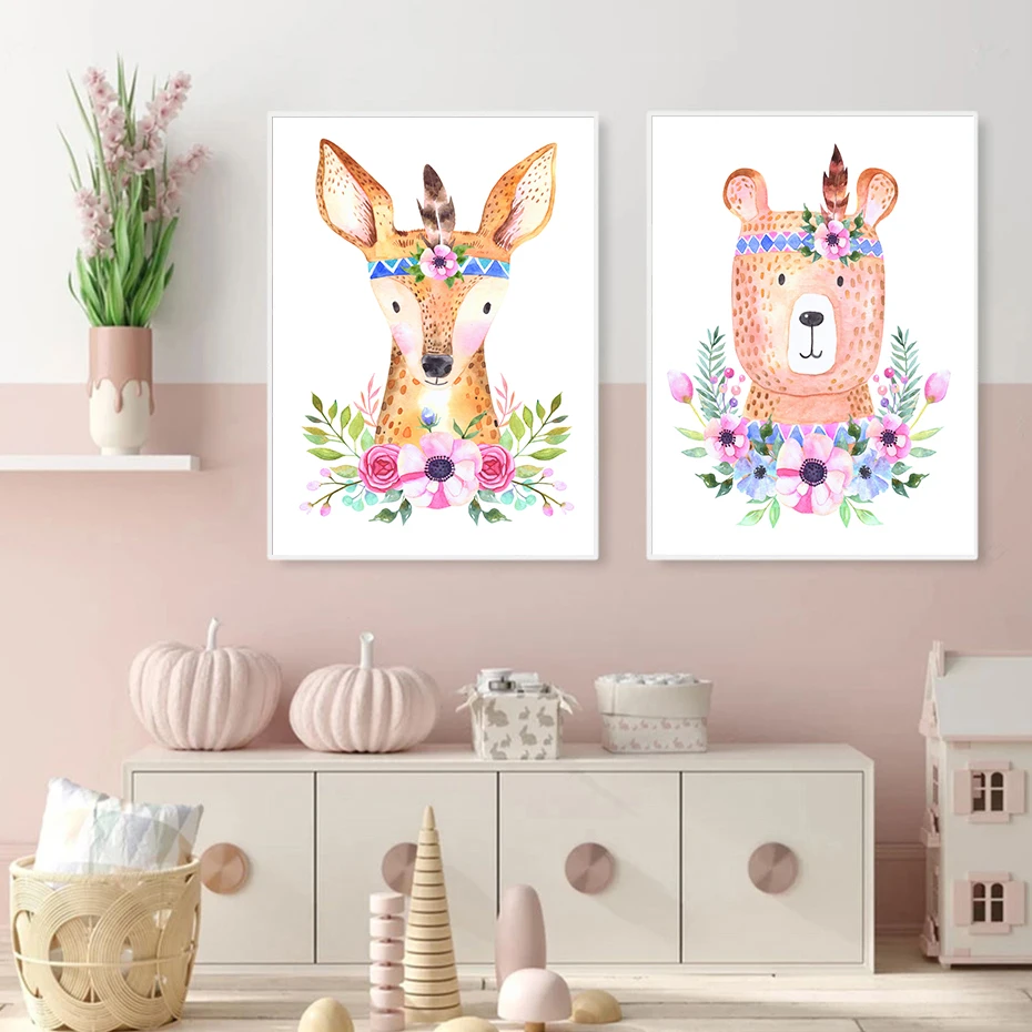 Акварельные лесные рисунки, цветы в стиле бохо, лиса, олень, медведь, настенные художественные принты, Картина на холсте, украшение детской комнаты
