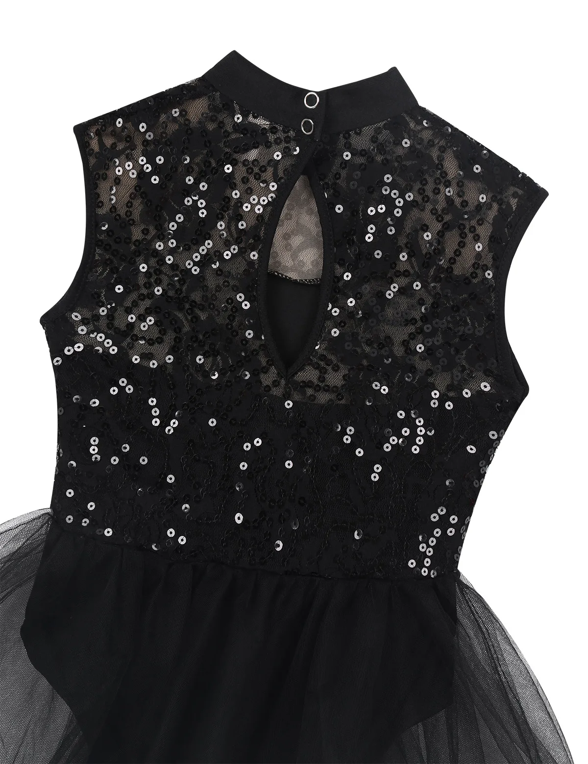 Без рукавов, с ложной горловиной и застежкой на пуговицы. Блестящий кружевной топ с блестками, с подкладкой. Замочная скважина сзади.