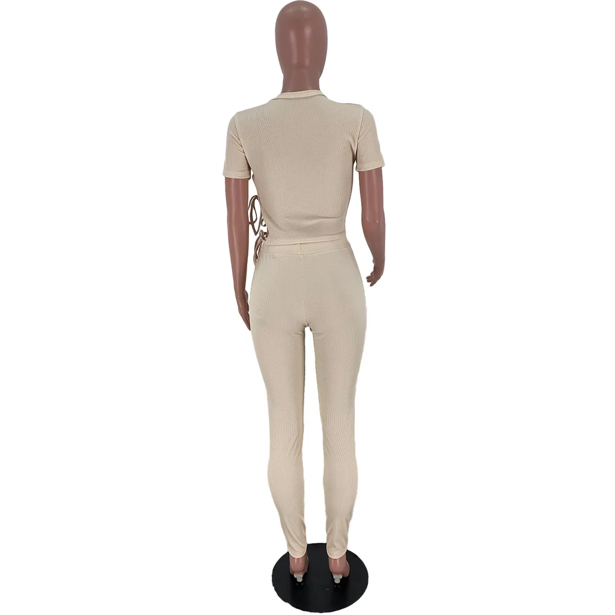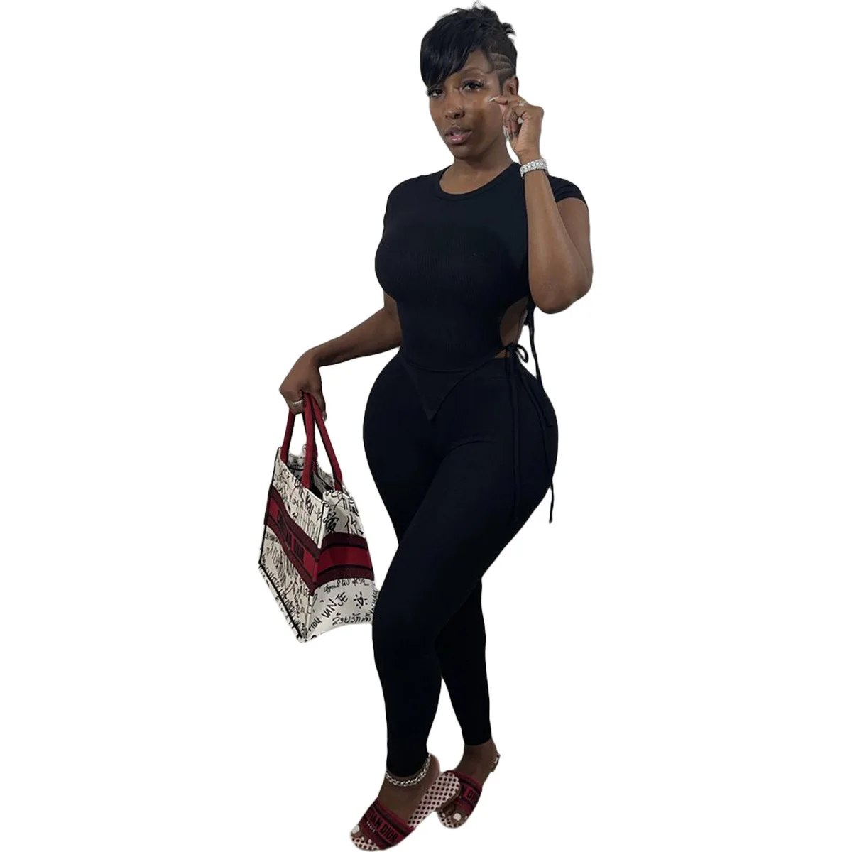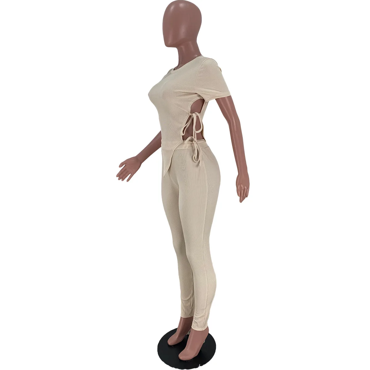 Костюм женский трикотажный в рубчик, повседневный укороченный топ без рукавов, с круглым вырезом, с боковой шнуровкой, брюки-карандаш, комплект из двух предметов, на лето