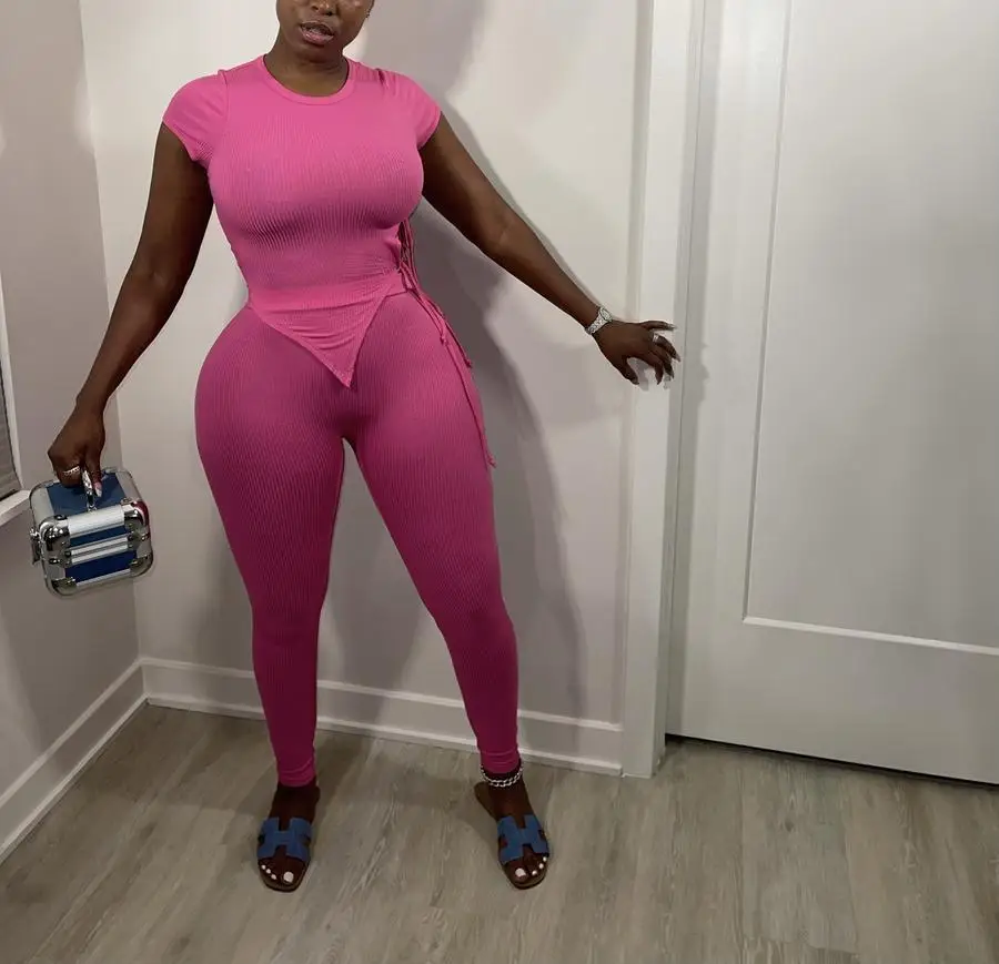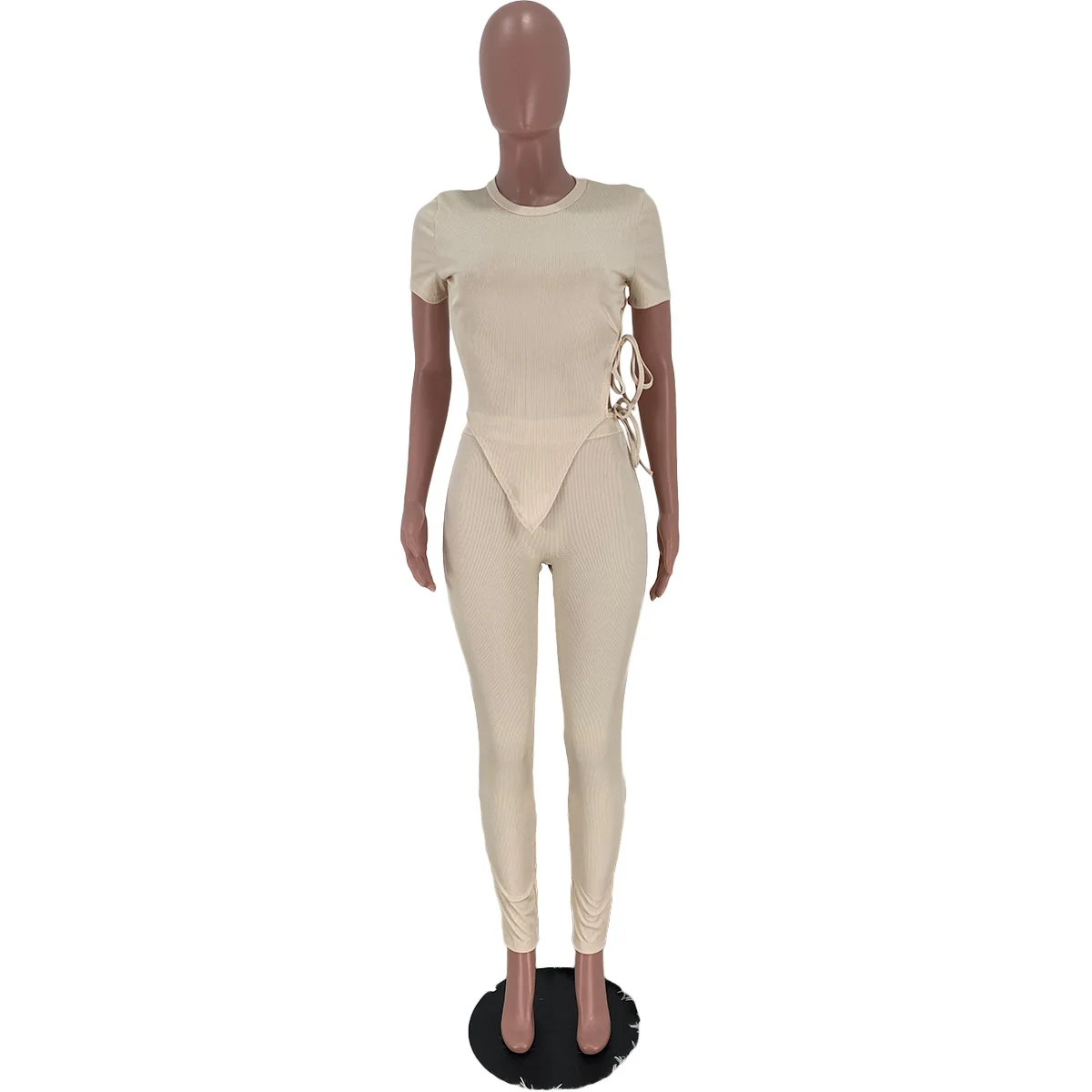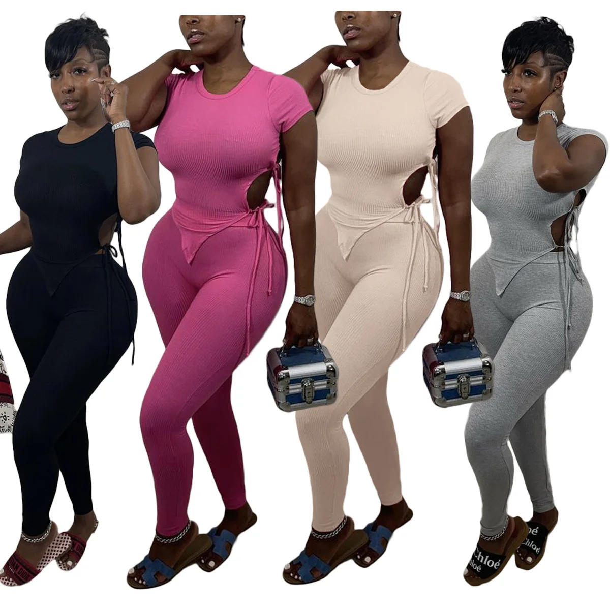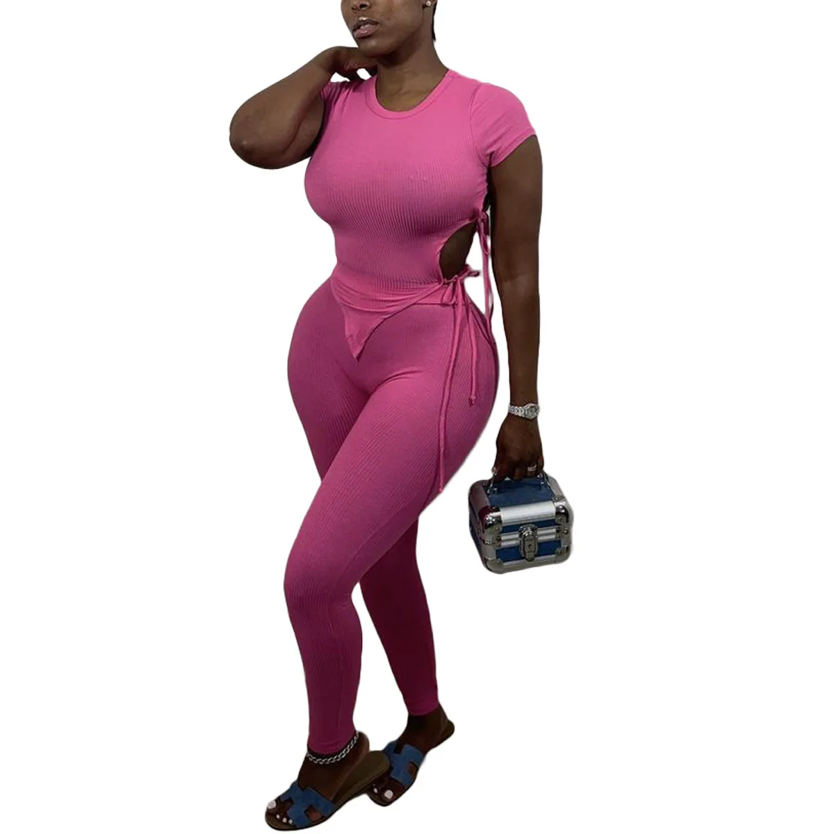 Костюм женский трикотажный в рубчик, повседневный укороченный топ без рукавов, с круглым вырезом, с боковой шнуровкой, брюки-карандаш, комплект из двух предметов, на лето