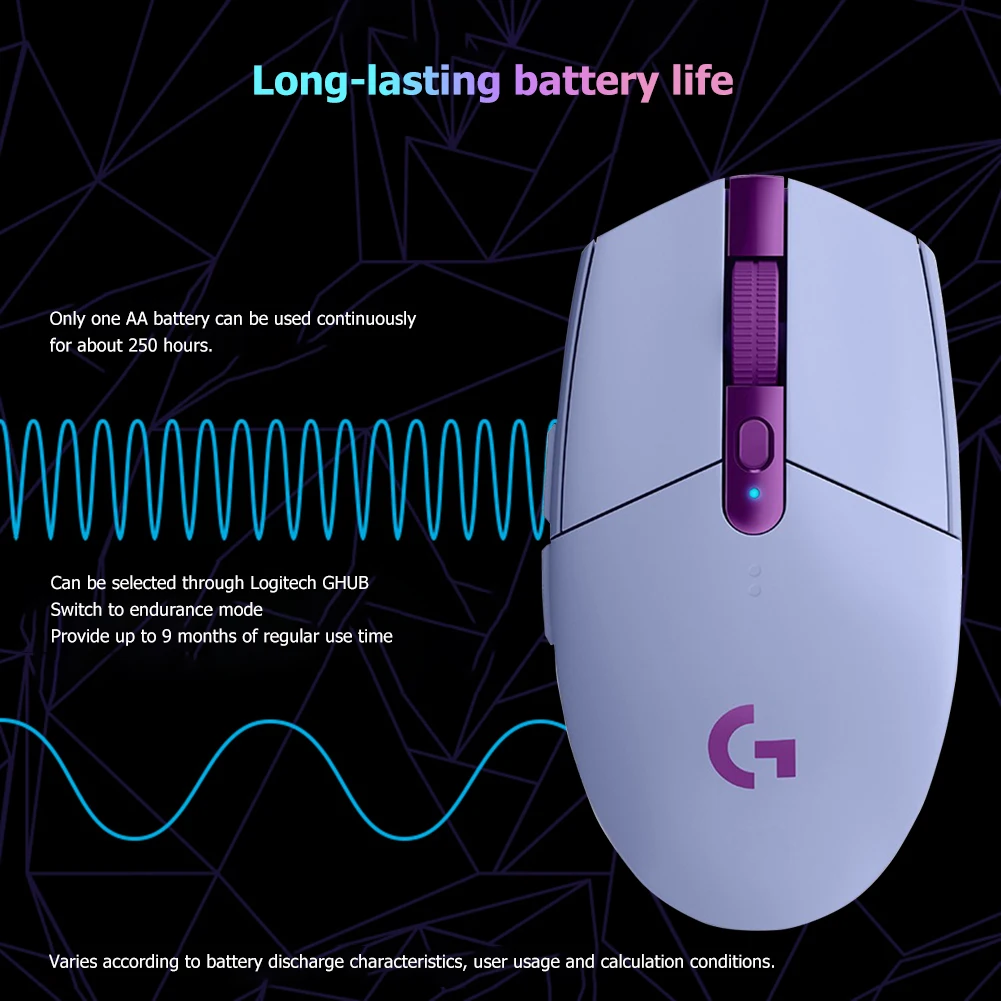 Датчик героя и беспроводная LIGHTSPEED обеспечивают экстремальную эффективность, чтобы вы могли играть в течение нескольких месяцев. Он обеспечивает до 250 часов работы на одной батарее AA. Его можно отрегулировать до 9 месяцев обычного использования в режиме выносливости, который можно выбрать с помощью Logitech G HUB. Протестированный на игровой коврик для мыши Logitech G240 Logitech G HUB, а также светильник индикатора на G304, уведомит вас, когда останется 15% батареи.