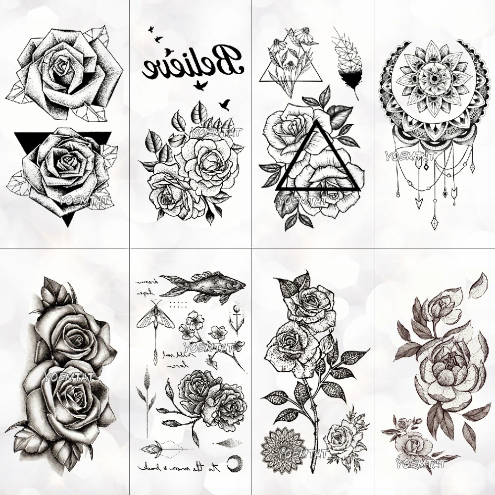 Черный геометрический КИТ временная татуировка Луны оленей наклейки-татуировки розы Для женщин вечерние средства ухода за кожей Arm арт штаны с фальш-вставкой, лист для мужчин с цветочным узором своими руками