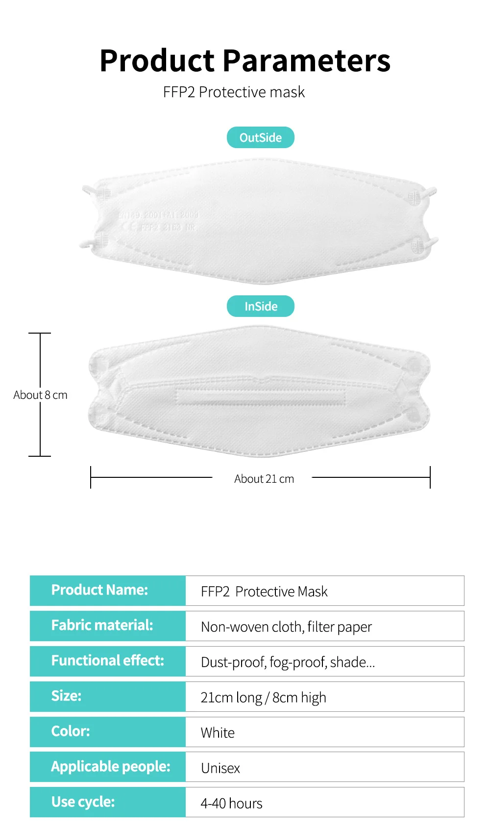 Преимущества масок для рыб:① Удобно носить.②Хороший эффект фильтрации, особенно для очень мелких частиц и пыли.③ Подходит для различных форм лица.④ Высококачественный защитный эффект. Его защитный эффект такой же, как и маска KN95, европейская маска FFP2.Applicable применяется в различных средах, где защитные маски необходимо носить в течение длительного времени, таких как фабрики, школы, компании, торговые центры, песчаные бури, строительные площадки, больницы, парки и т. Д.Пожалуйста, обратите внимание, что указанный Товар производится и распространен за рубежом и в соответствии с законодательством страны его происхождения.