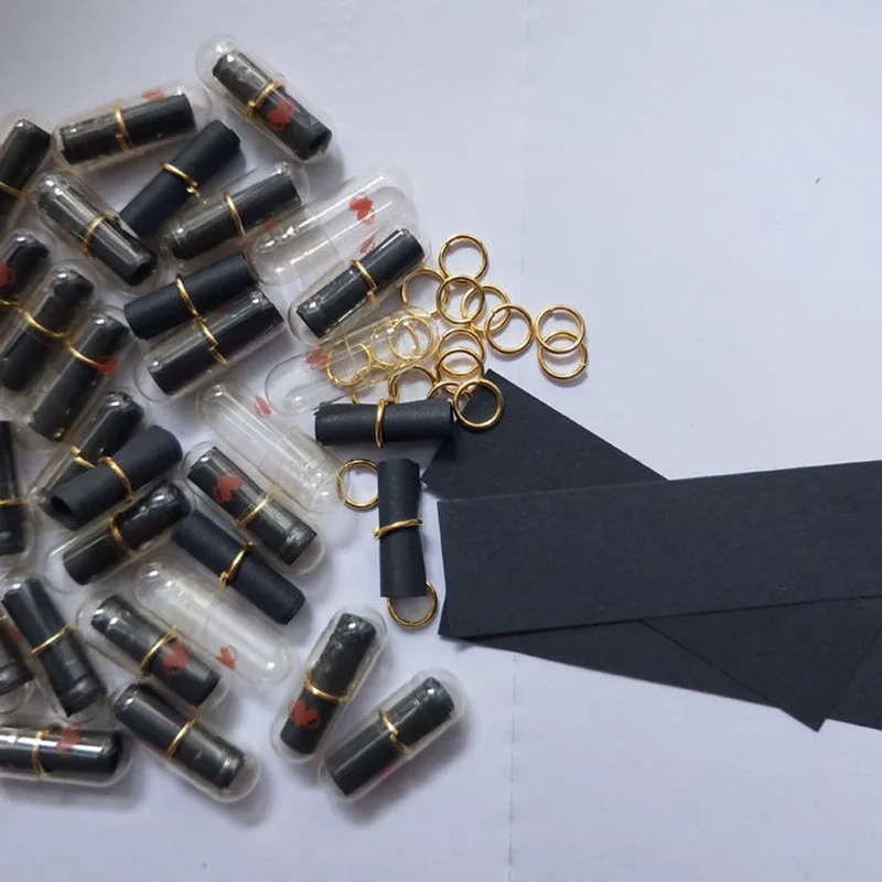 Название: 100 шт капсулы для сообщенийРазмеры: 2*0,6 смЦвет: черныйМатериал: пластикИспользование: вечеринка на день рождения, небольшие подаркиВ таблетке есть кусок чистой бумаги, вы можете написать все, что захотите.Ваше чувство, ваши секты, слова, которые Вы не хотели бы сказать напрямую, могут быть написаны здесь.Это волшебная таблетка, которая может исцелить ваше плохое настроение; Это хороший подарок для тех, кого вы любите.Примечание: черная бумага требует особого цвета.(В магазине есть цветные ручки. Если они вам нужны, вы можете пойти в магазин, чтобы купить их.)Капсула не может прикоснуться к воде, она расплавится.Примечание: Потому что любовь капсула для письма является готовым продуктом.Некоторые друзья хотят сделать свой собственный, легко писать, увеличить творческие способности.DIY полуфабрикаты теперь доступны для вас на выбор. Цена также будет более выгодной.Бумага, капсула, обруч, мы дадим вам небольшую палку, чтобы легко закатать бумагу.После написания намотайте бумагу маленькой палочкой, наденьте на нее железное кольцо, откройте капсулу и закройте ее.Сделайте это самостоятельно. Это очень легко и весело.