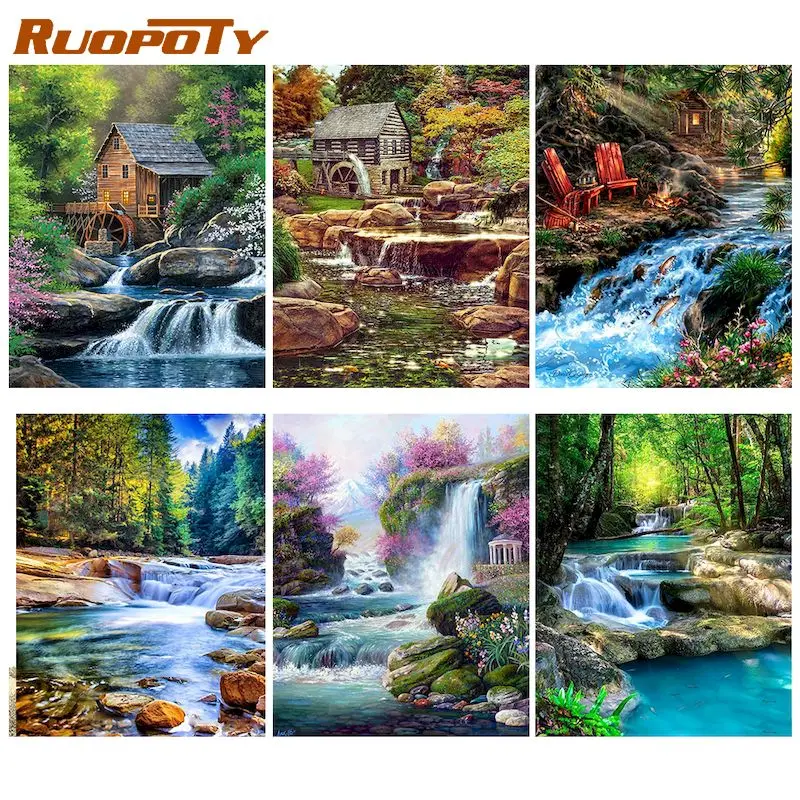 Пейзаж RUOPOTY для взрослых, мост, река и дом, набор для рисования ...